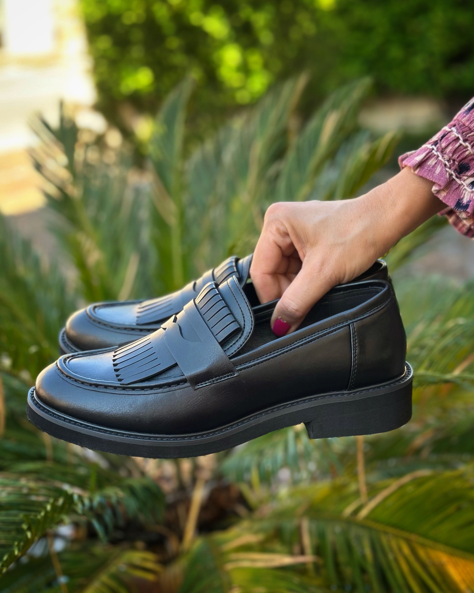 Mocassino con frangia, suola in gomma.