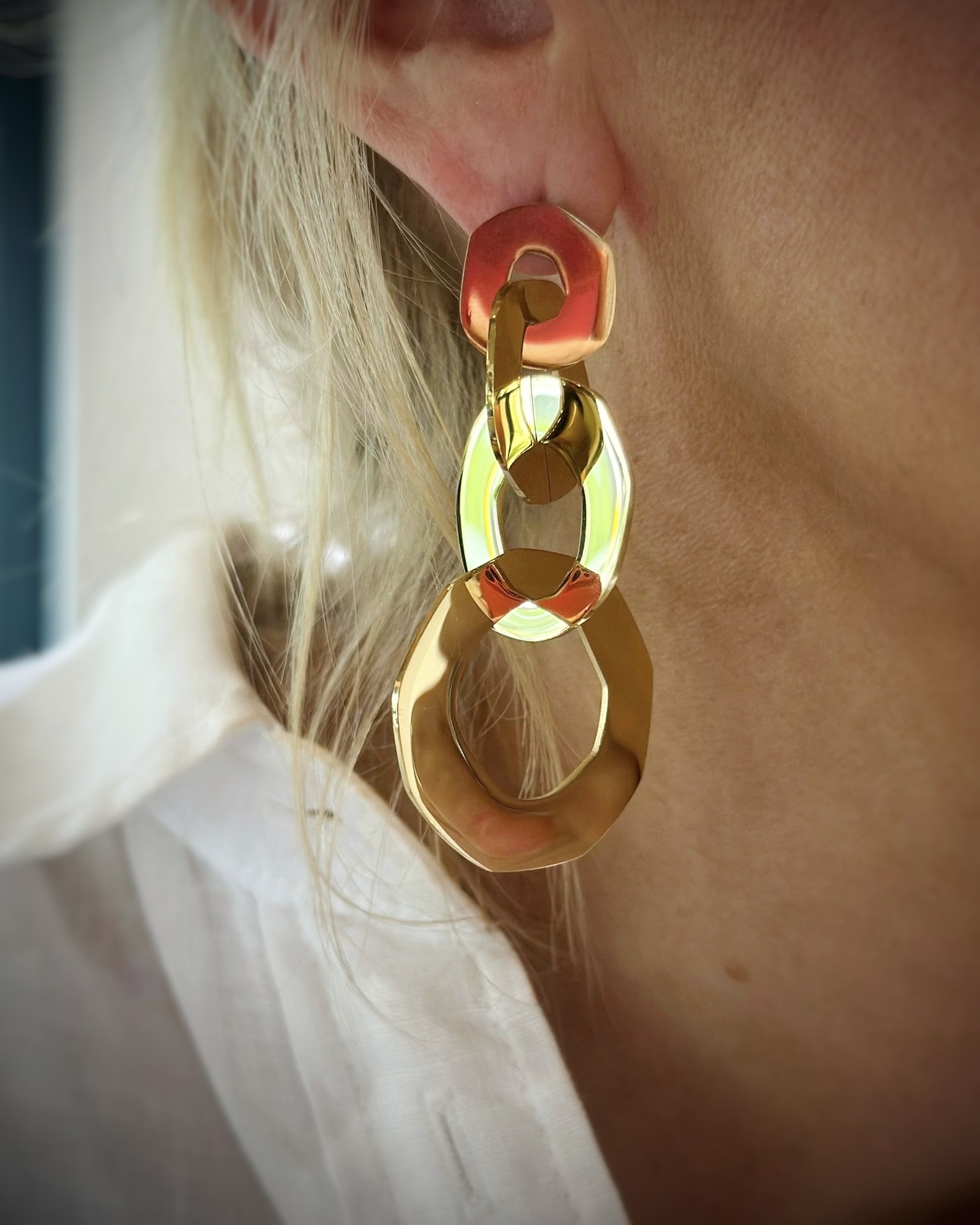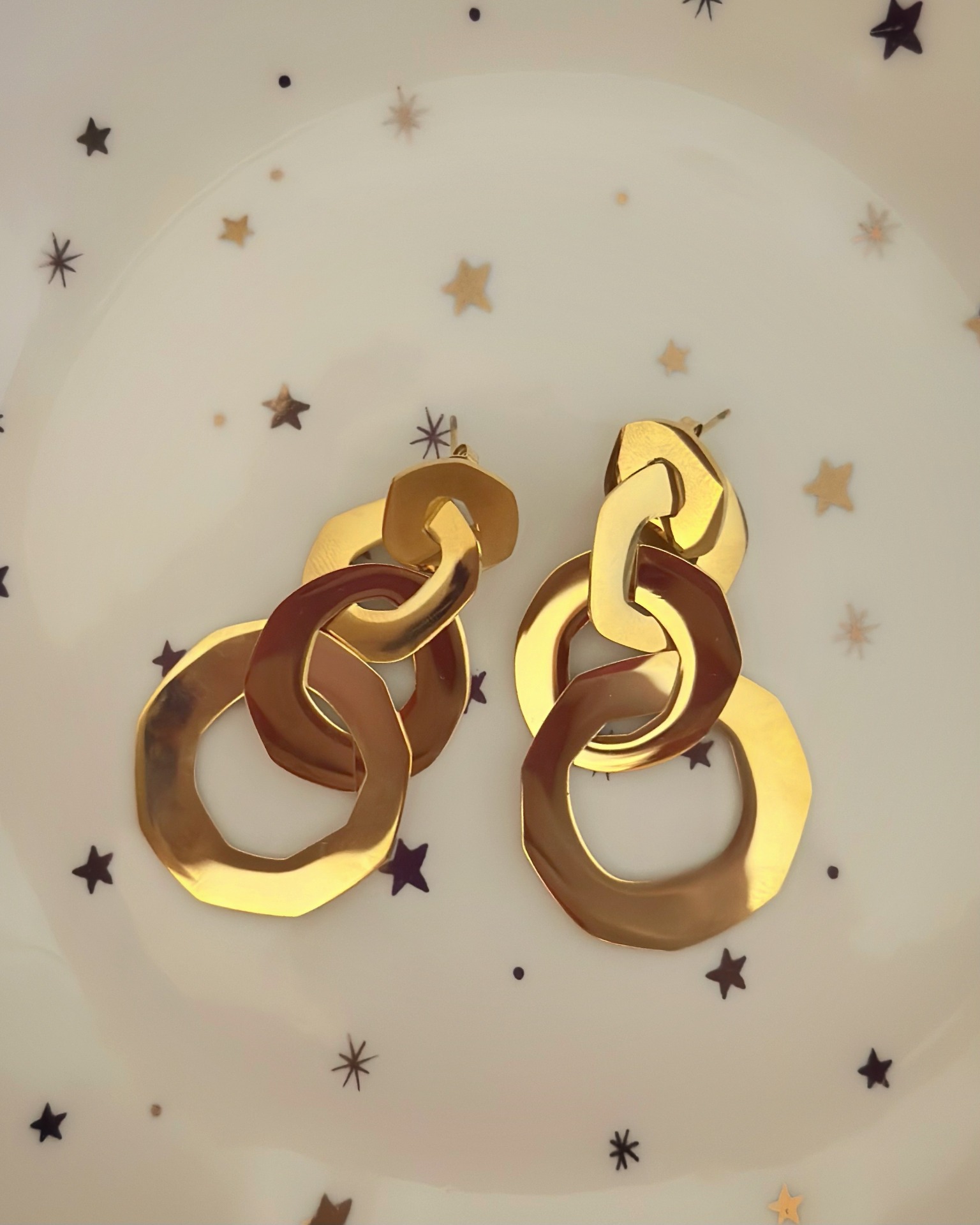 Orecchini con 3 cerchi dorati concatenati in acciaio. Lunghezza 5,5 cm, larghezza 3,5 cm.