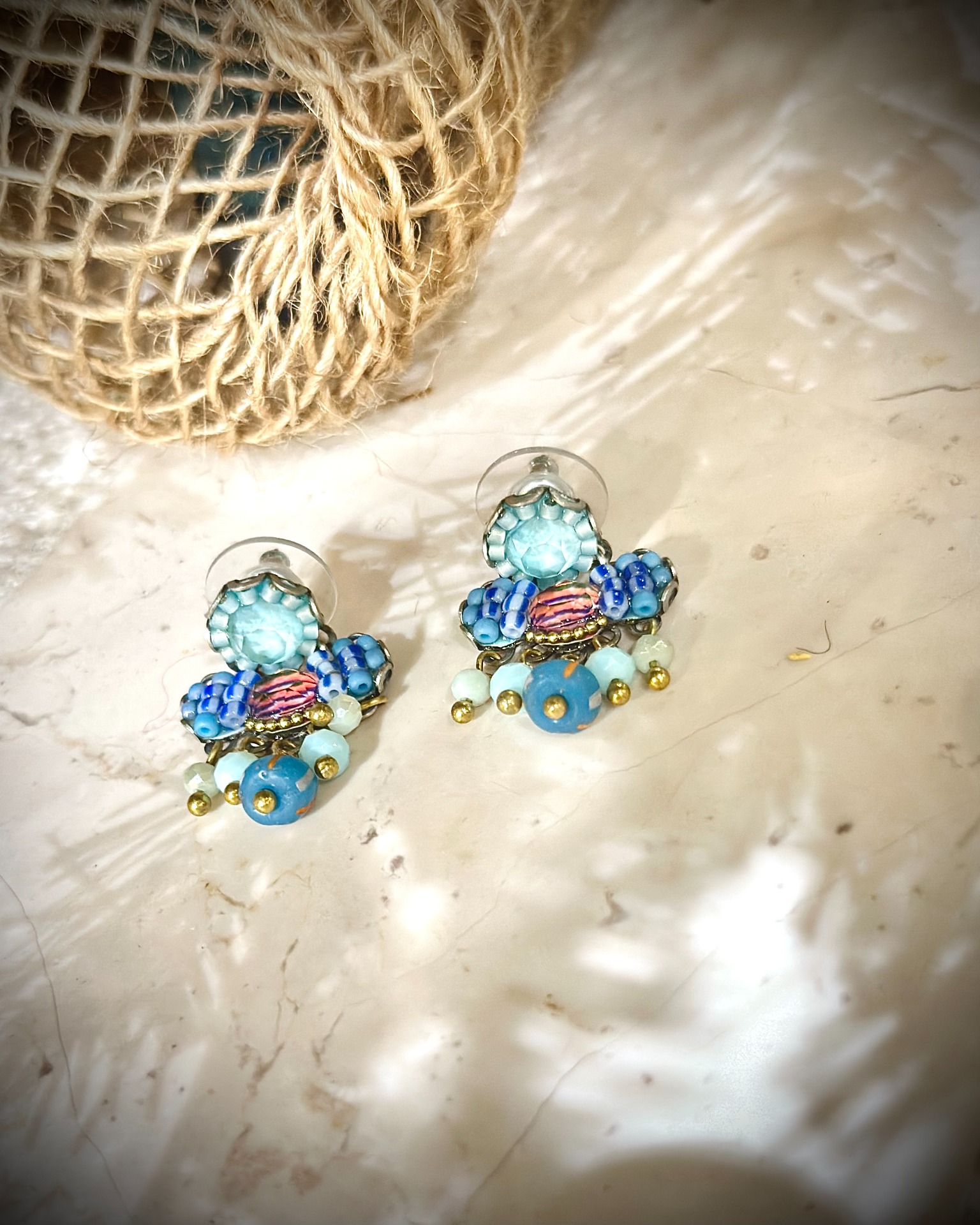 Orecchini fatti a mano con perline, cristalli, passamanerie e resine colorate.