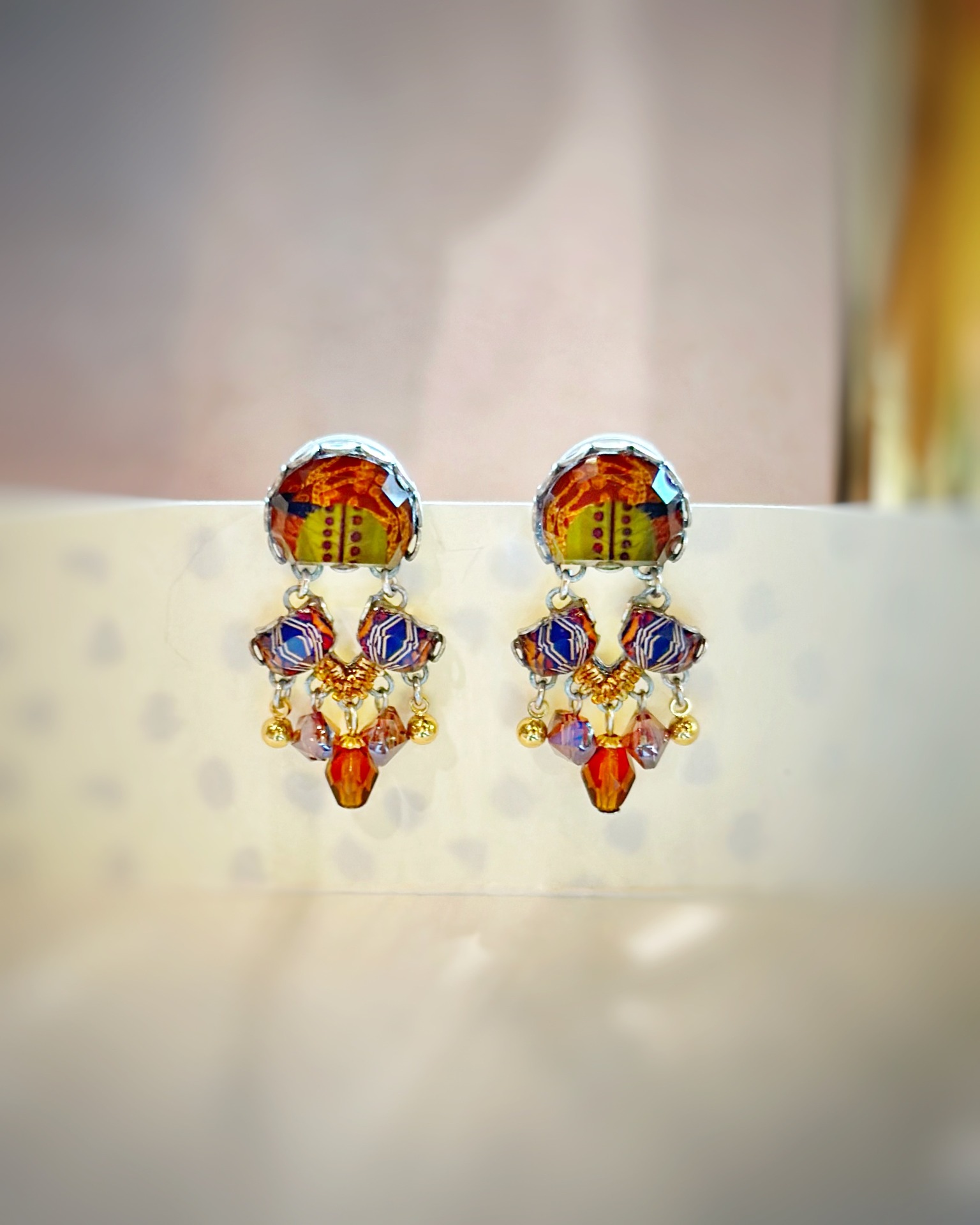 Orecchini fatti a mano con perline, cristalli, passamanerie e resine colorate.