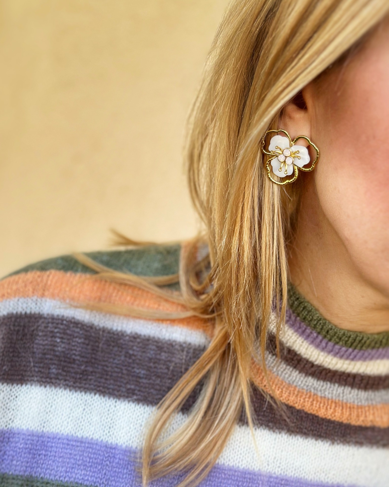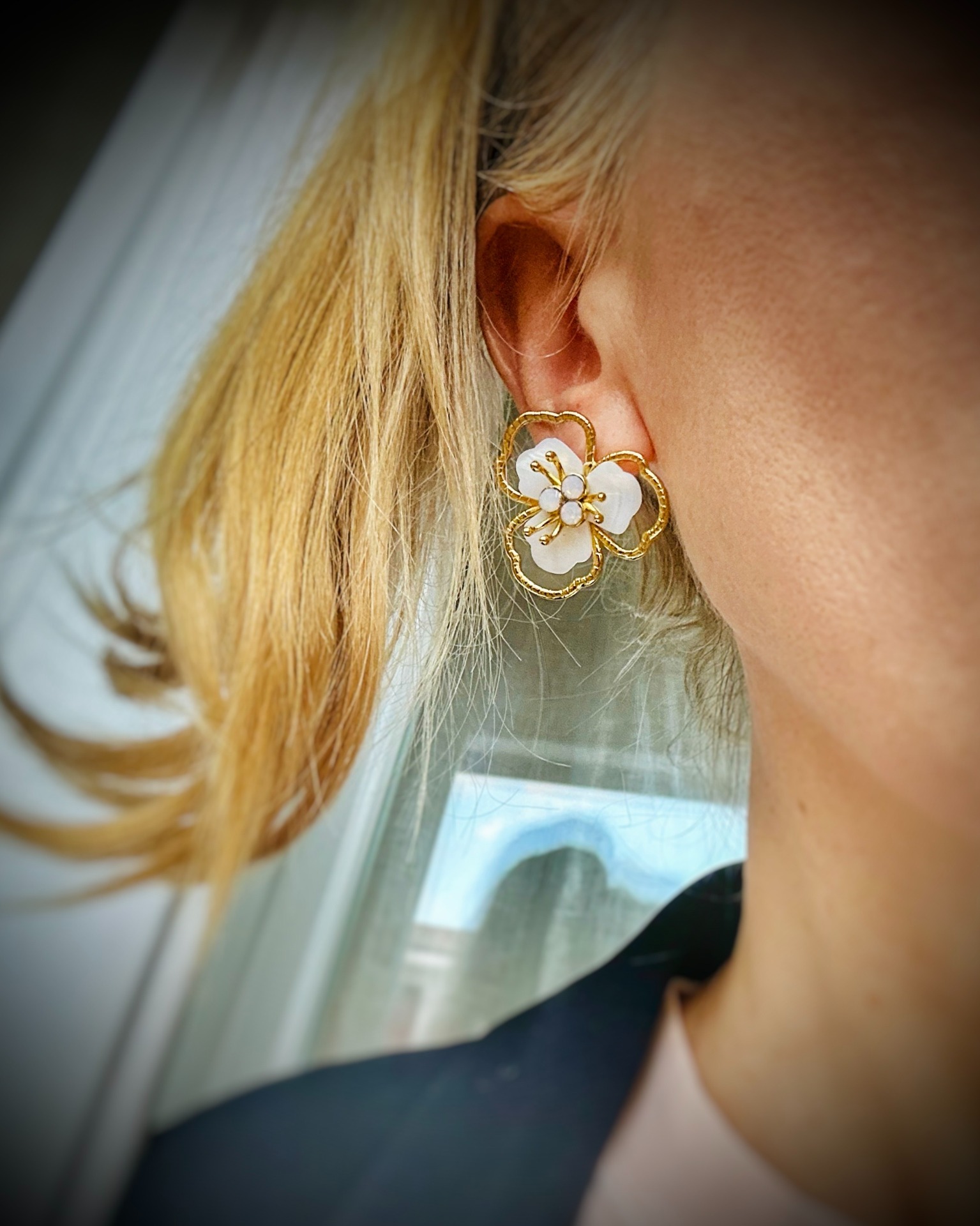 Orecchini in ottone con fiore in madreperla e Swarovski. Lunghezza 3 cm, larghezza 3 cm.