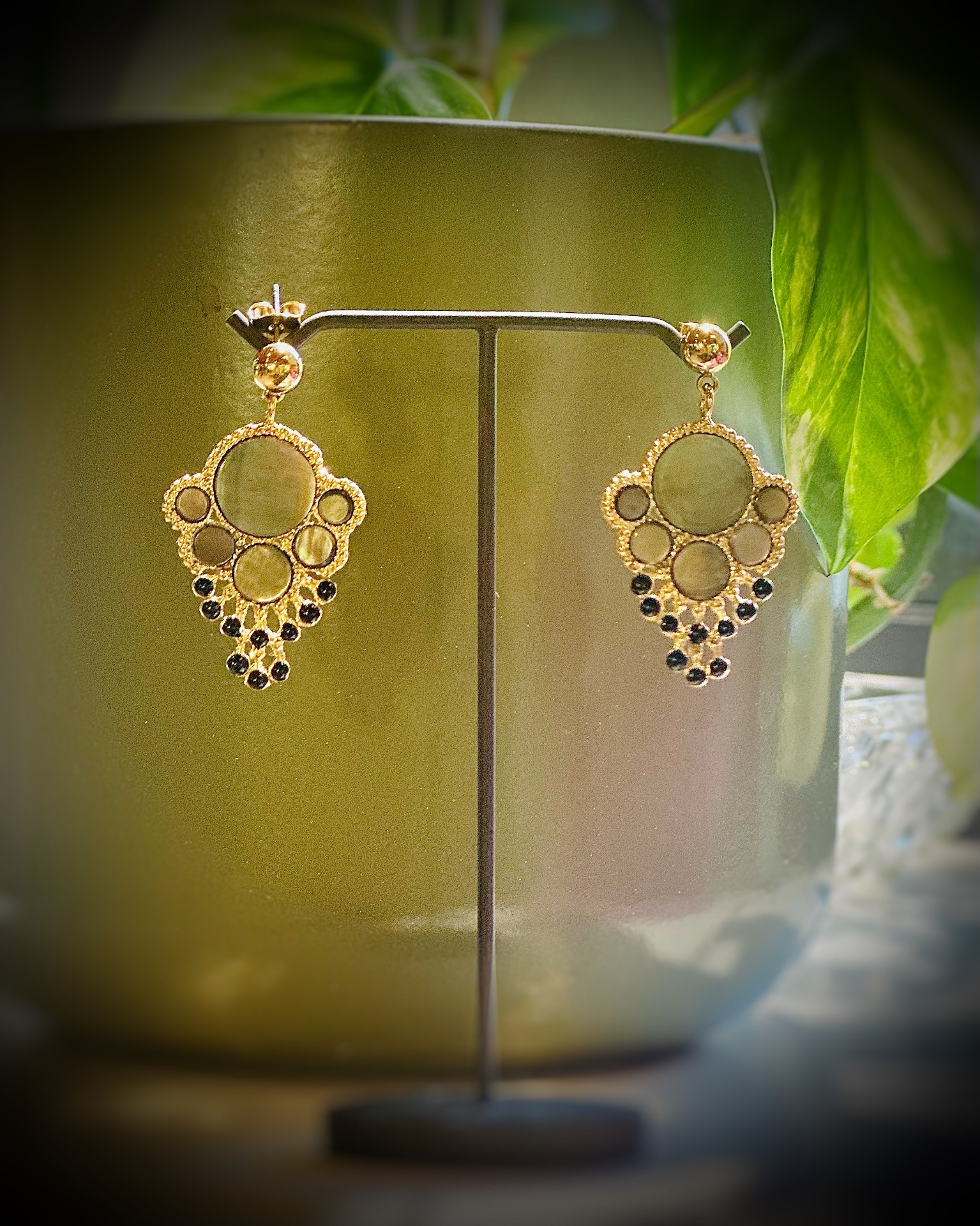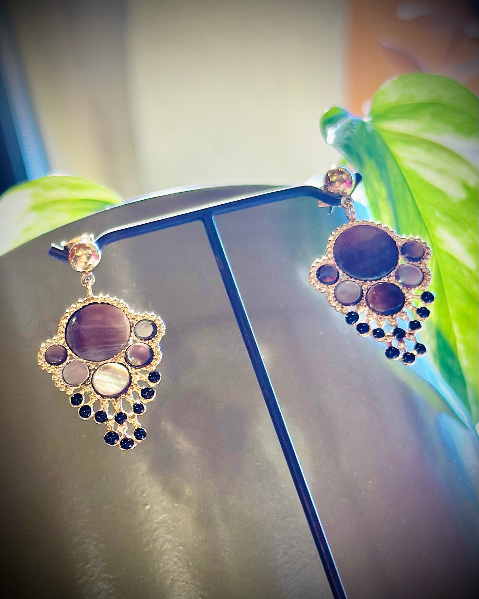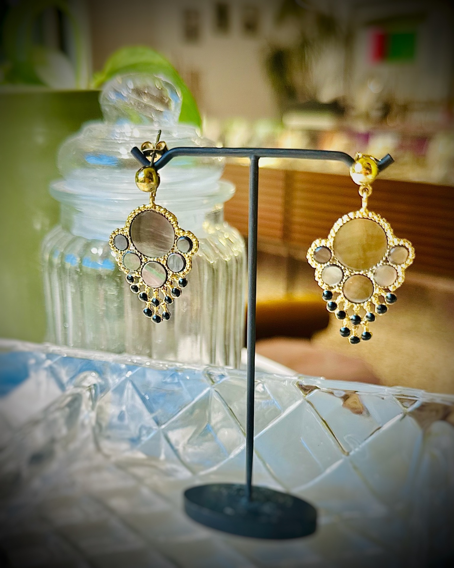 Orecchini in ottone placcato gold, madreperla fumè e smalto nero.