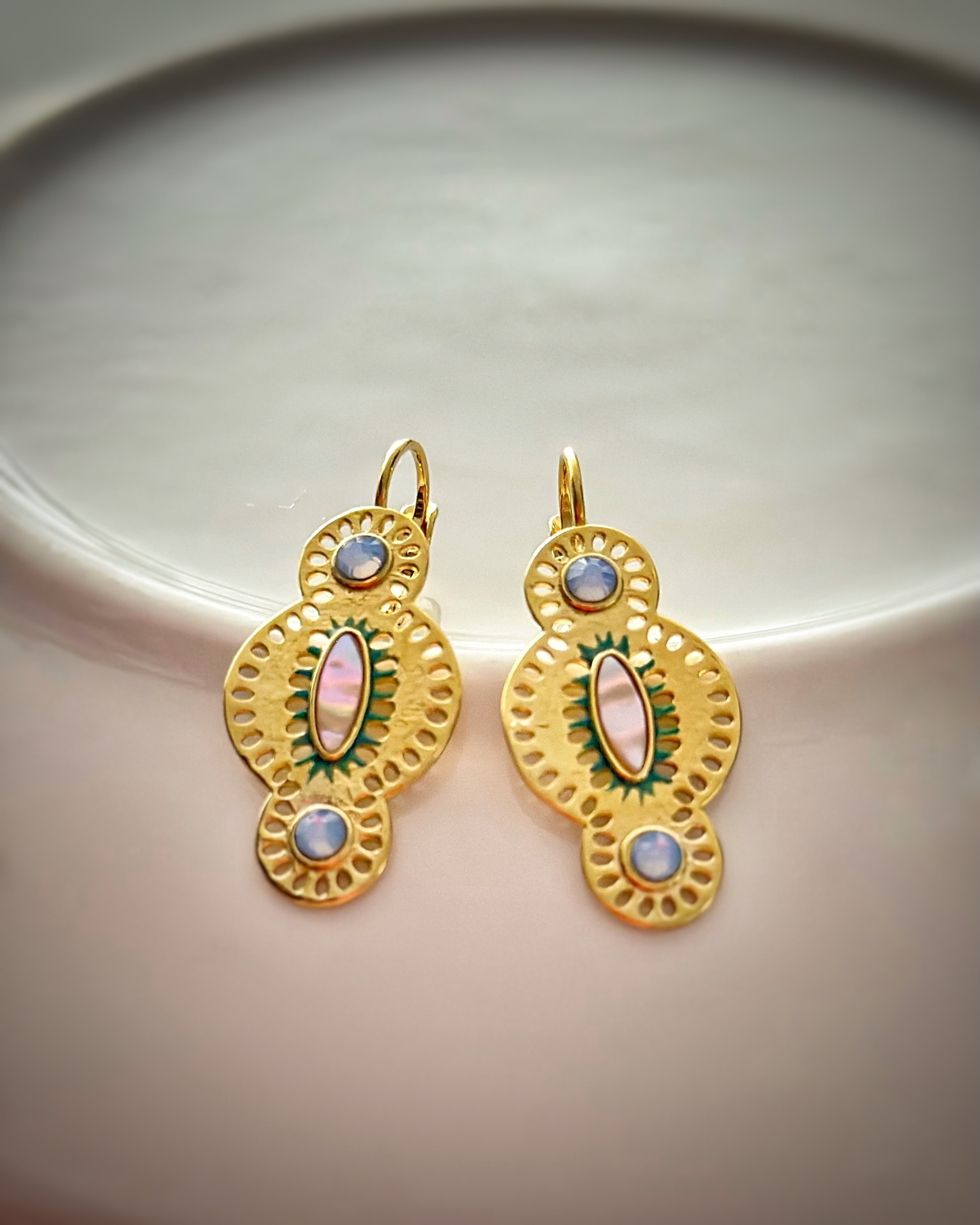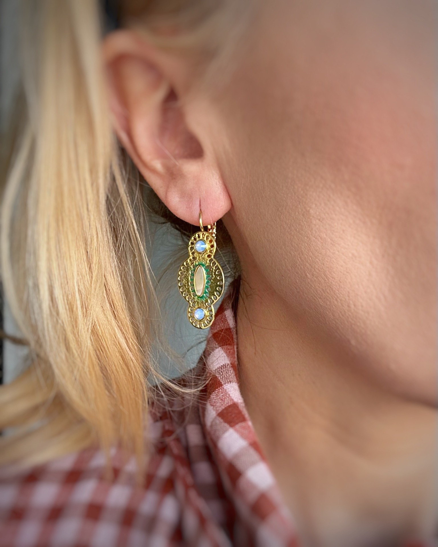 Orecchini dorati, realizzati in ottone con madreperla, pietre Swarovski e resina verde. Lunghezza 4 cm, larghezza 1,5 cm.