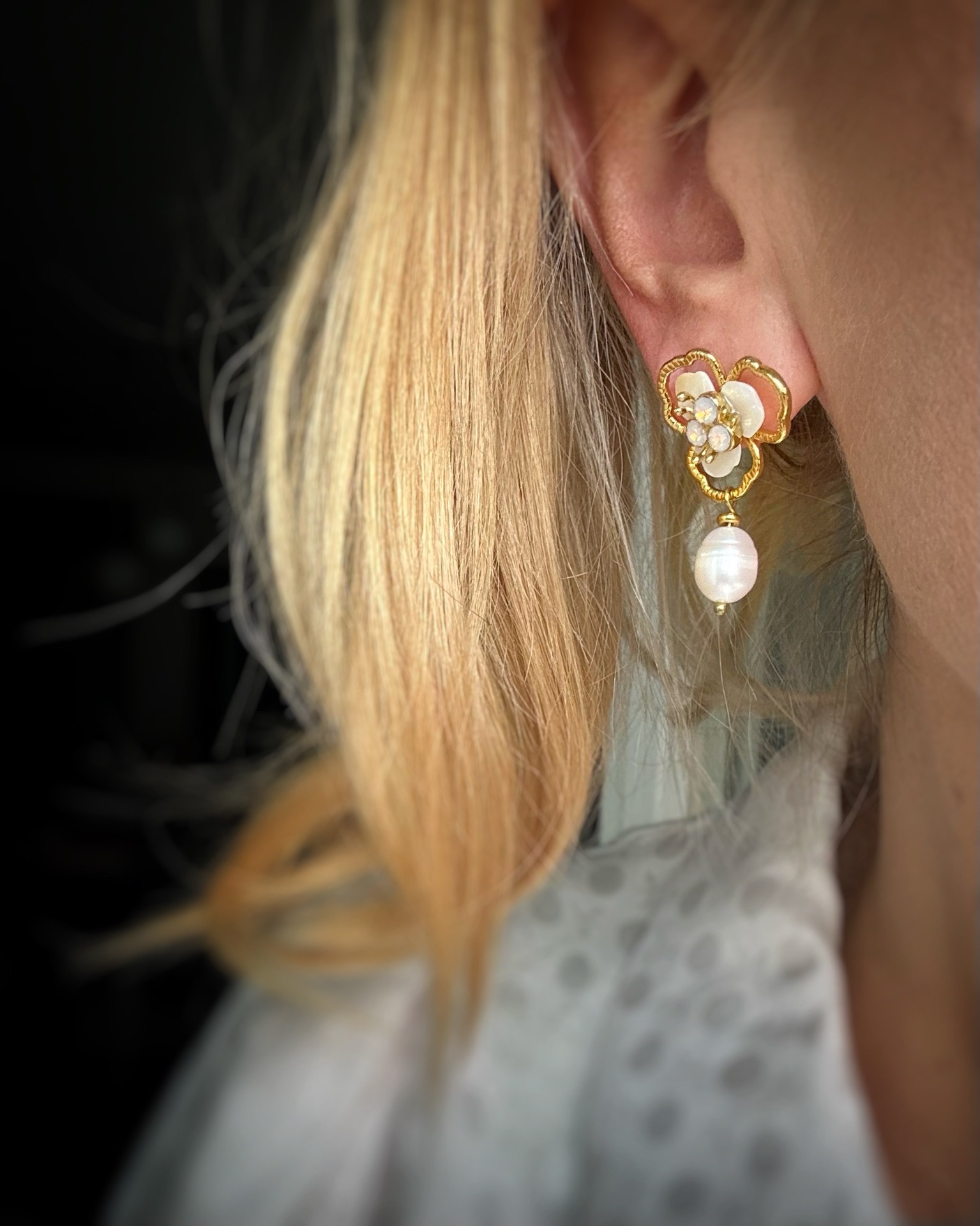 Orecchini fiore con perla pendente, in ottone con perla, Swarovski, madreperla. Lunghezza 3,5 cm, larghezza 2 cm.