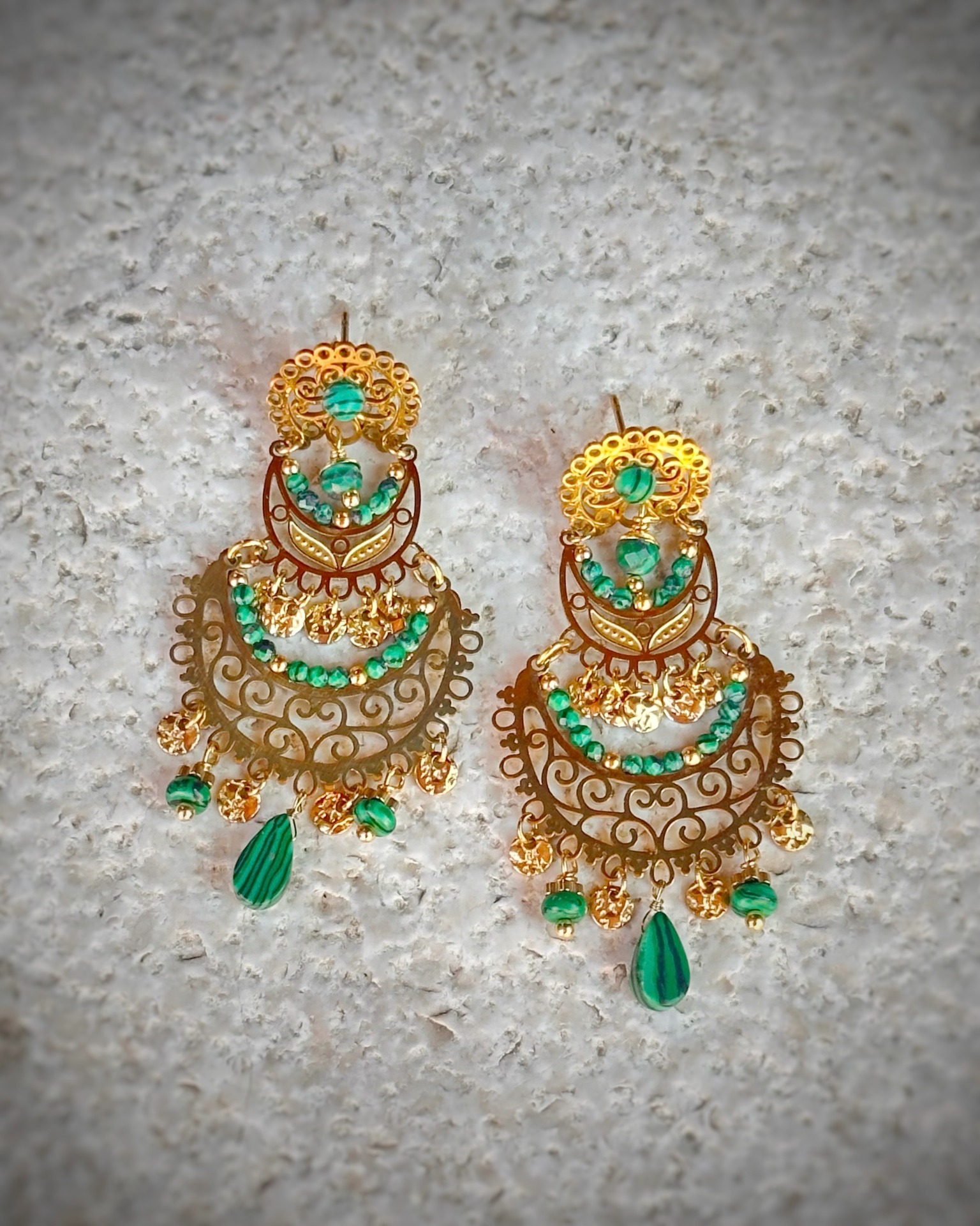 Orecchini in acciaio dorato, pietre naturali. Lunghezza 5,5 cm.