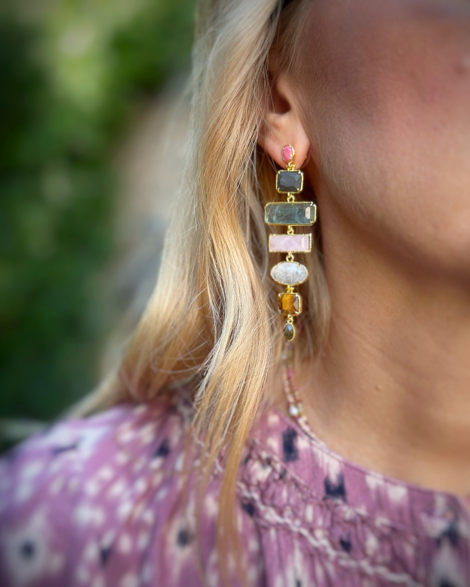 Orecchini in acciaio dorato, pietre naturali. Lunghezza 8cm.