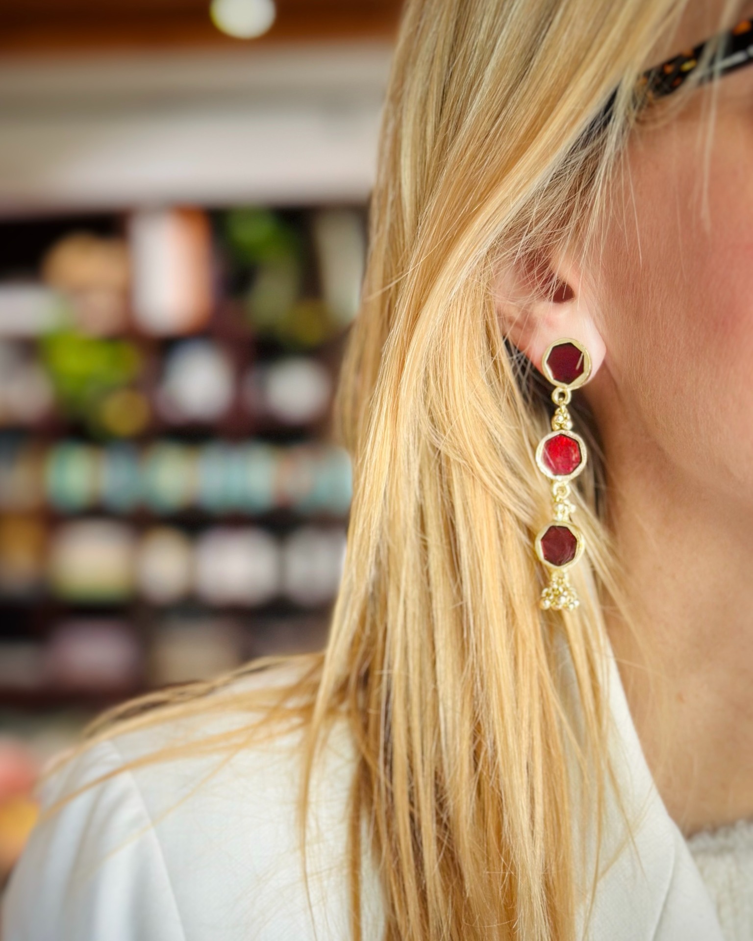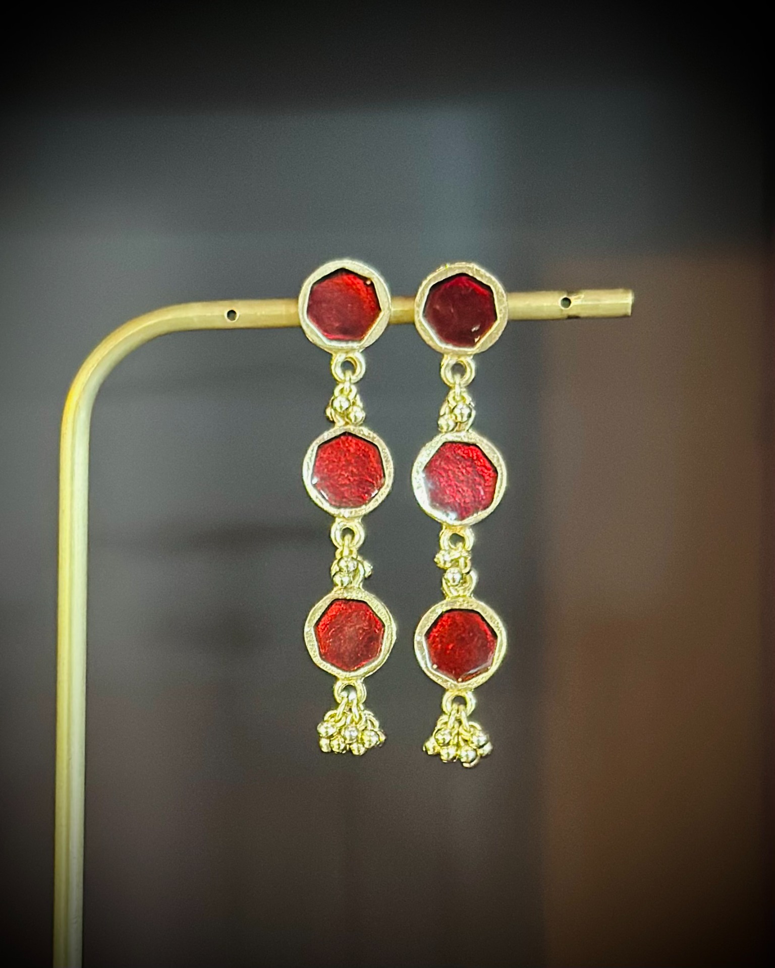 Orecchini artigianali realizzati in India composti 3 da elementi smaltati. Misure 6,5 cm x 1 cm.