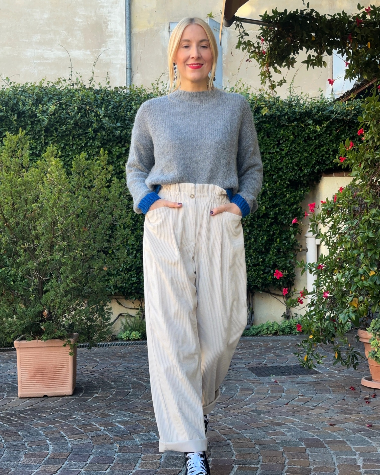 Pantalone in velluto a vita alta colore ecrù. Composizione 100% cotone.