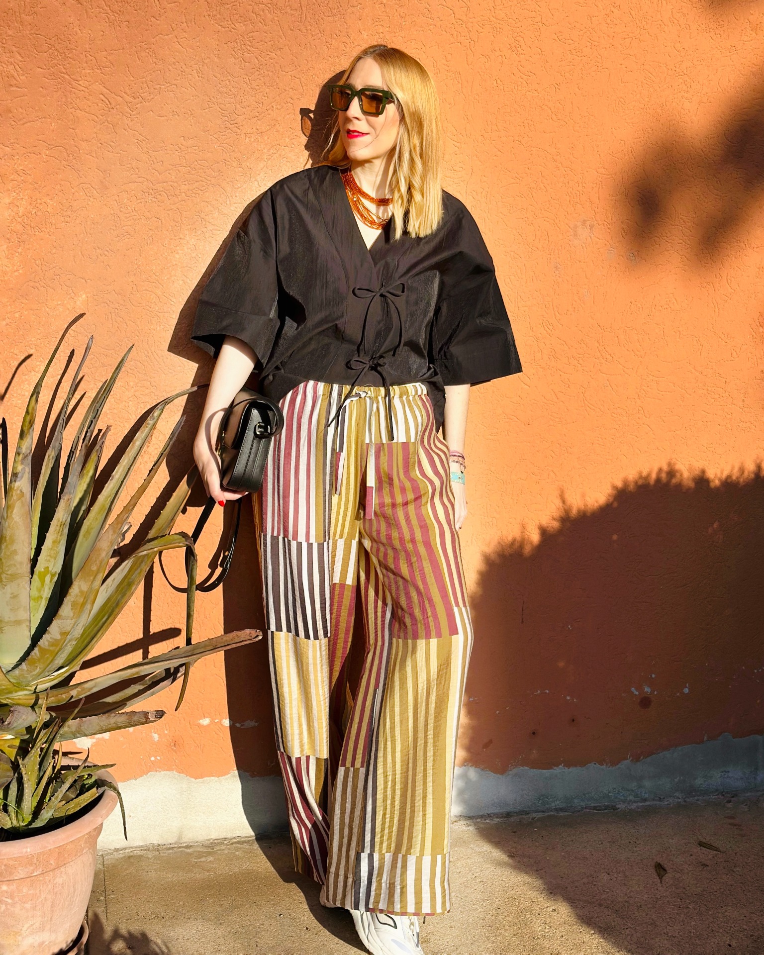Pantalone a righe, gamba larga con cinturino elastico in vita e coulisse.