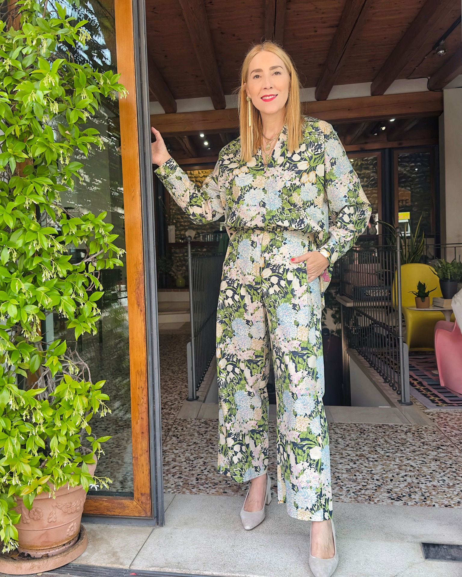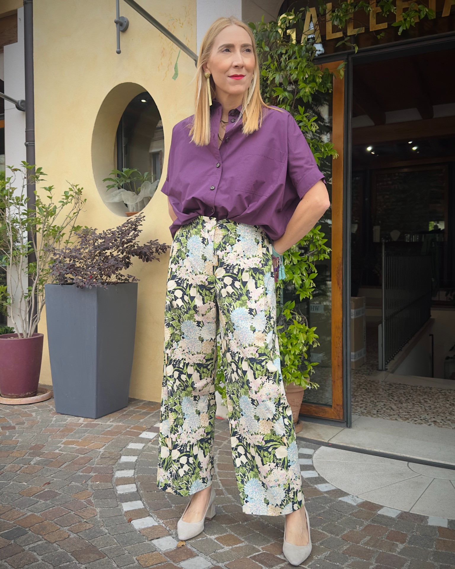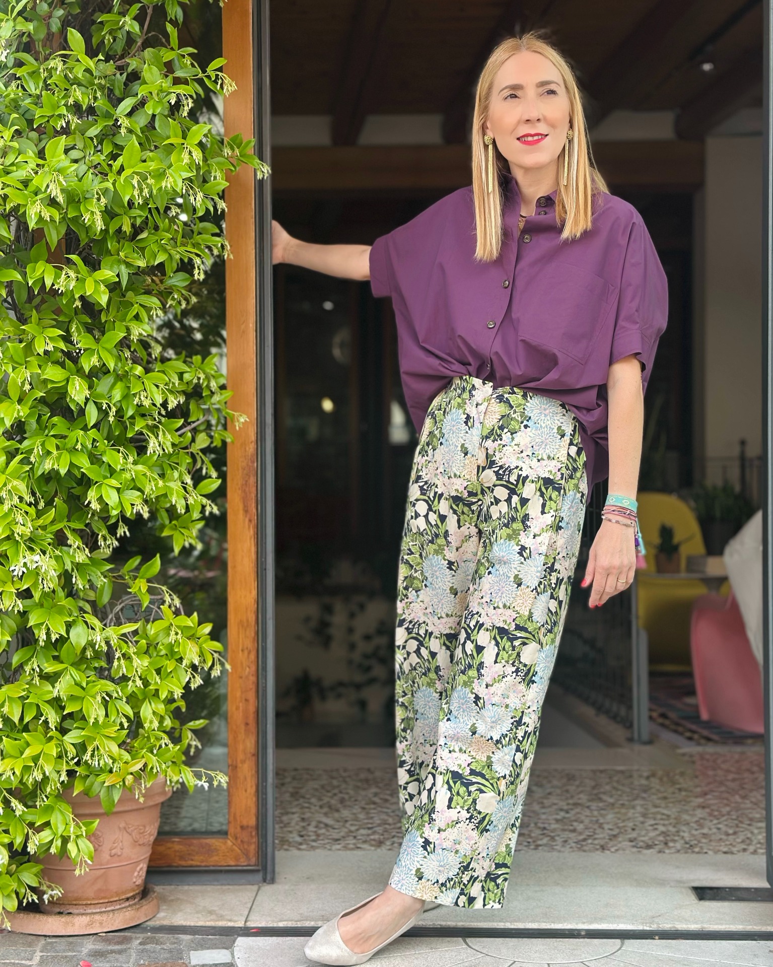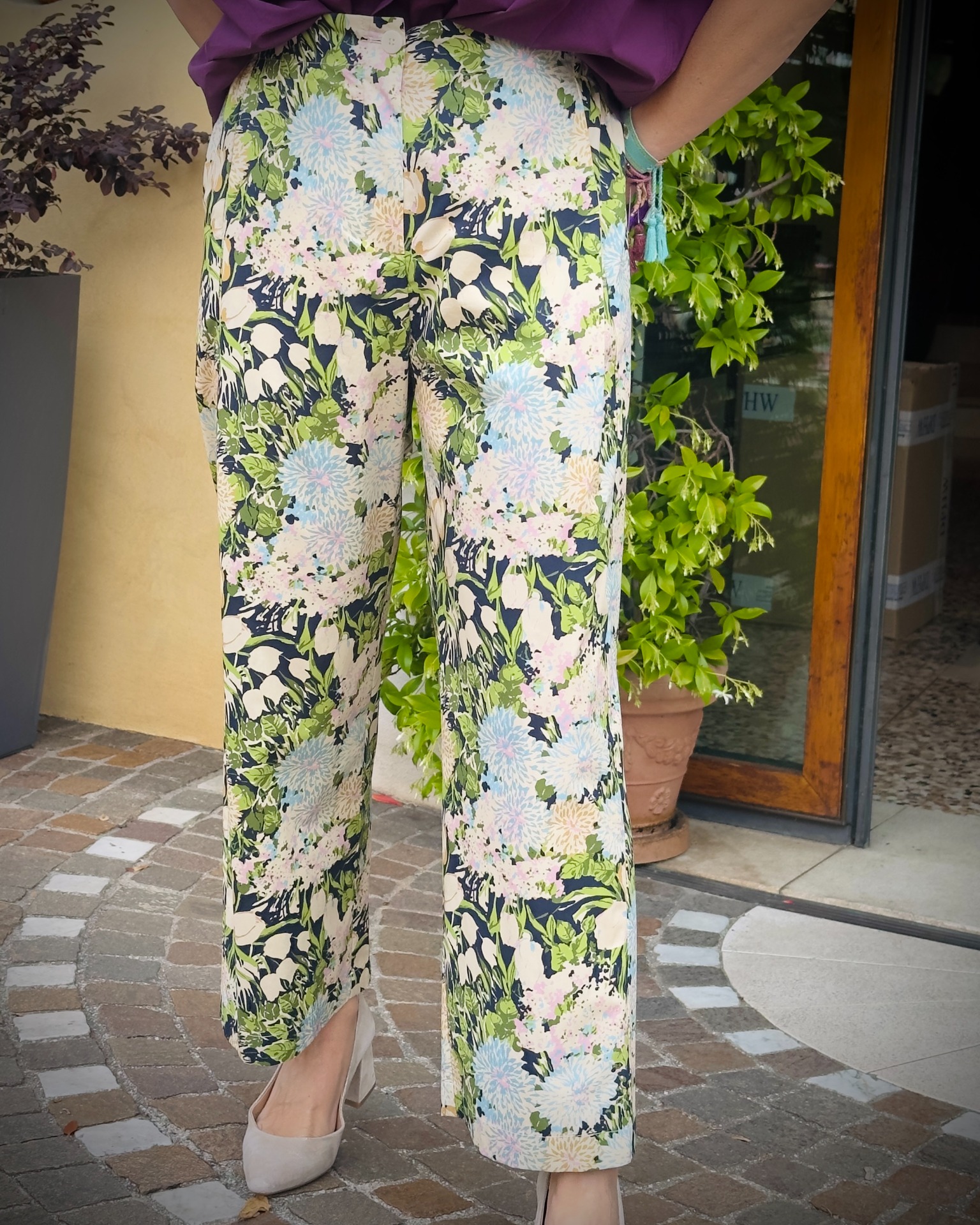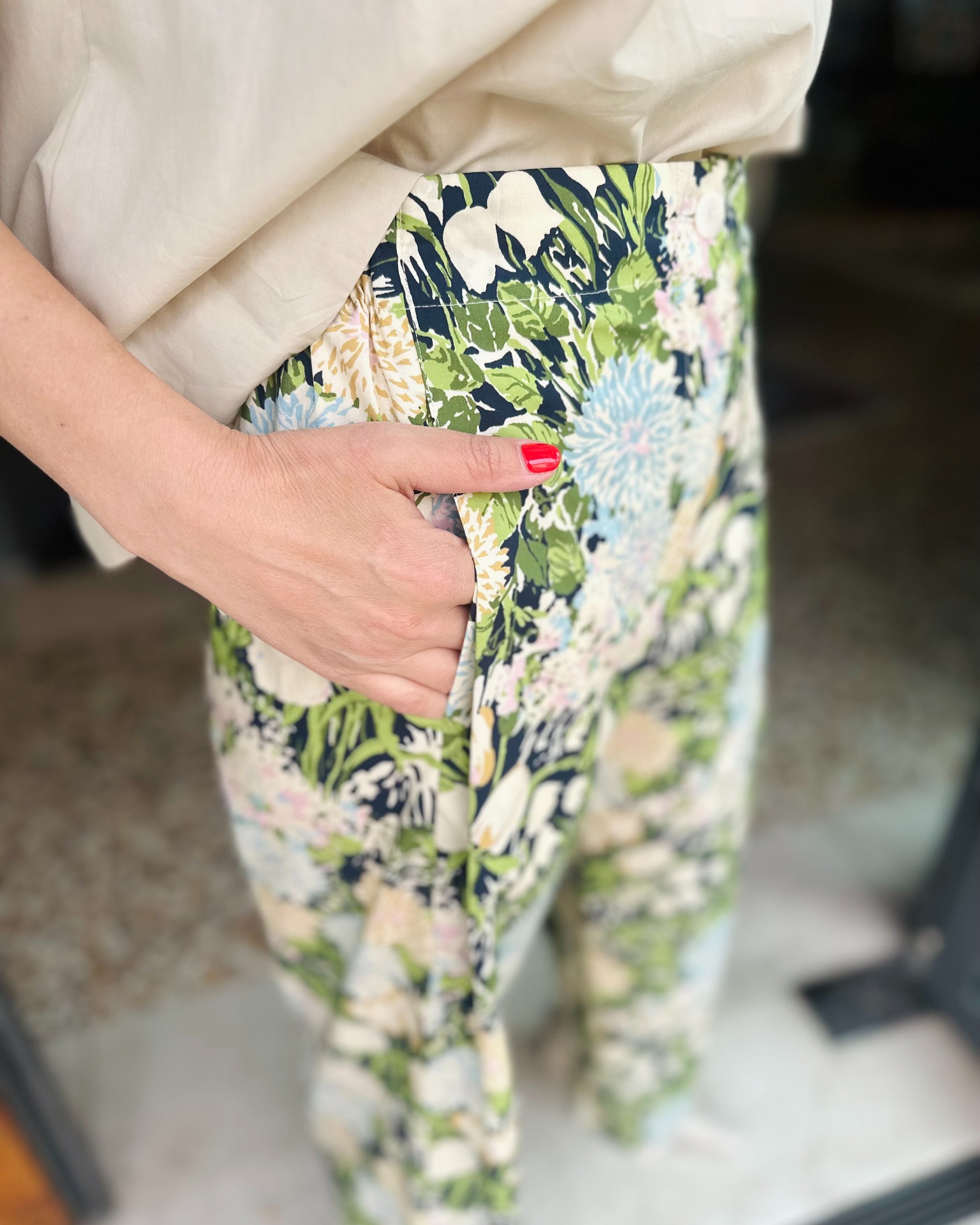 Pantaloni in 100% cotone con stampa floreale, chiusura ad un bottone sul davanti e inserto elasticizzato sul retro. Tasche laterali.