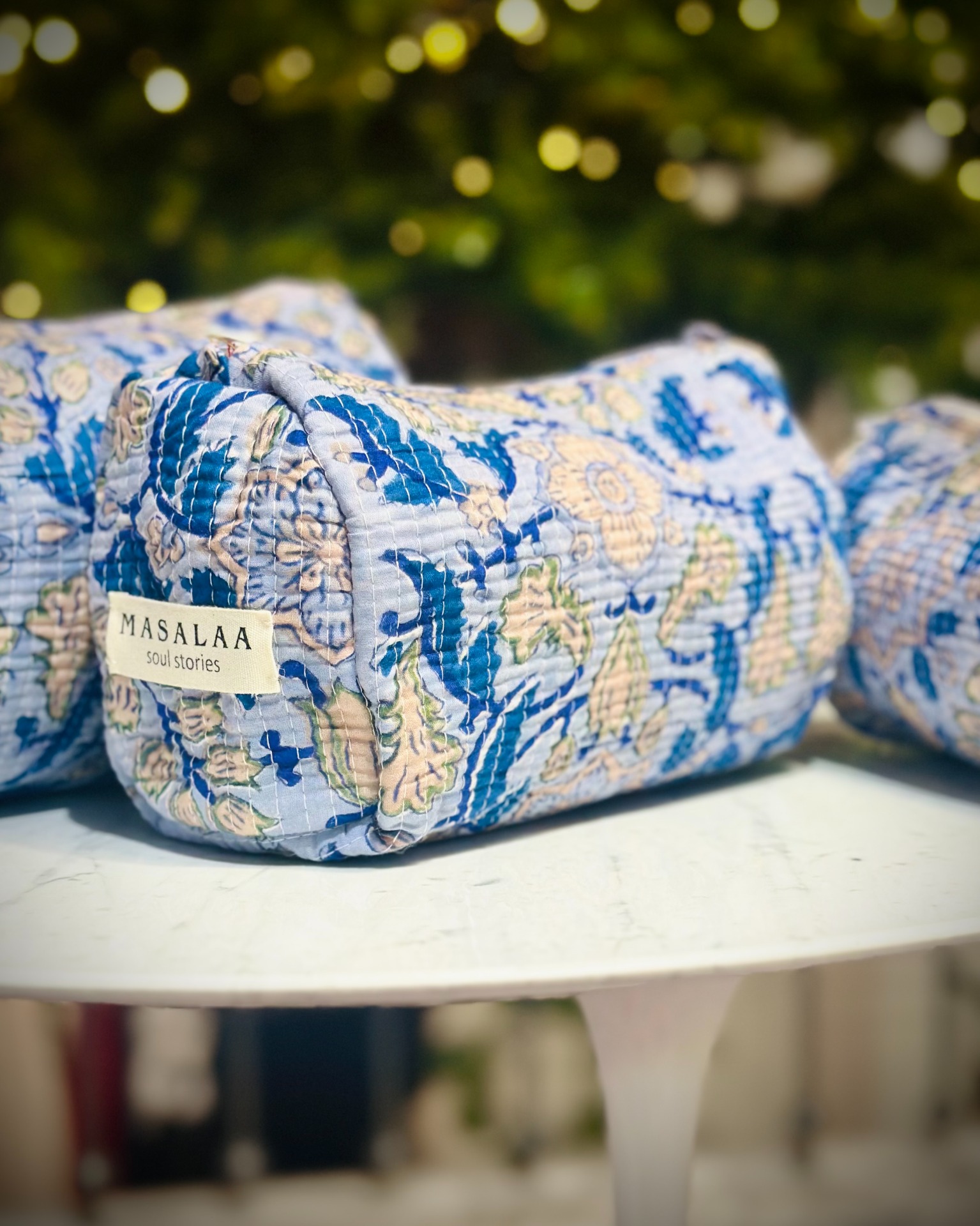Set di 3 pochette in cotone stampato a mano, chiusura con zip e rivestimento interno impermeabile.