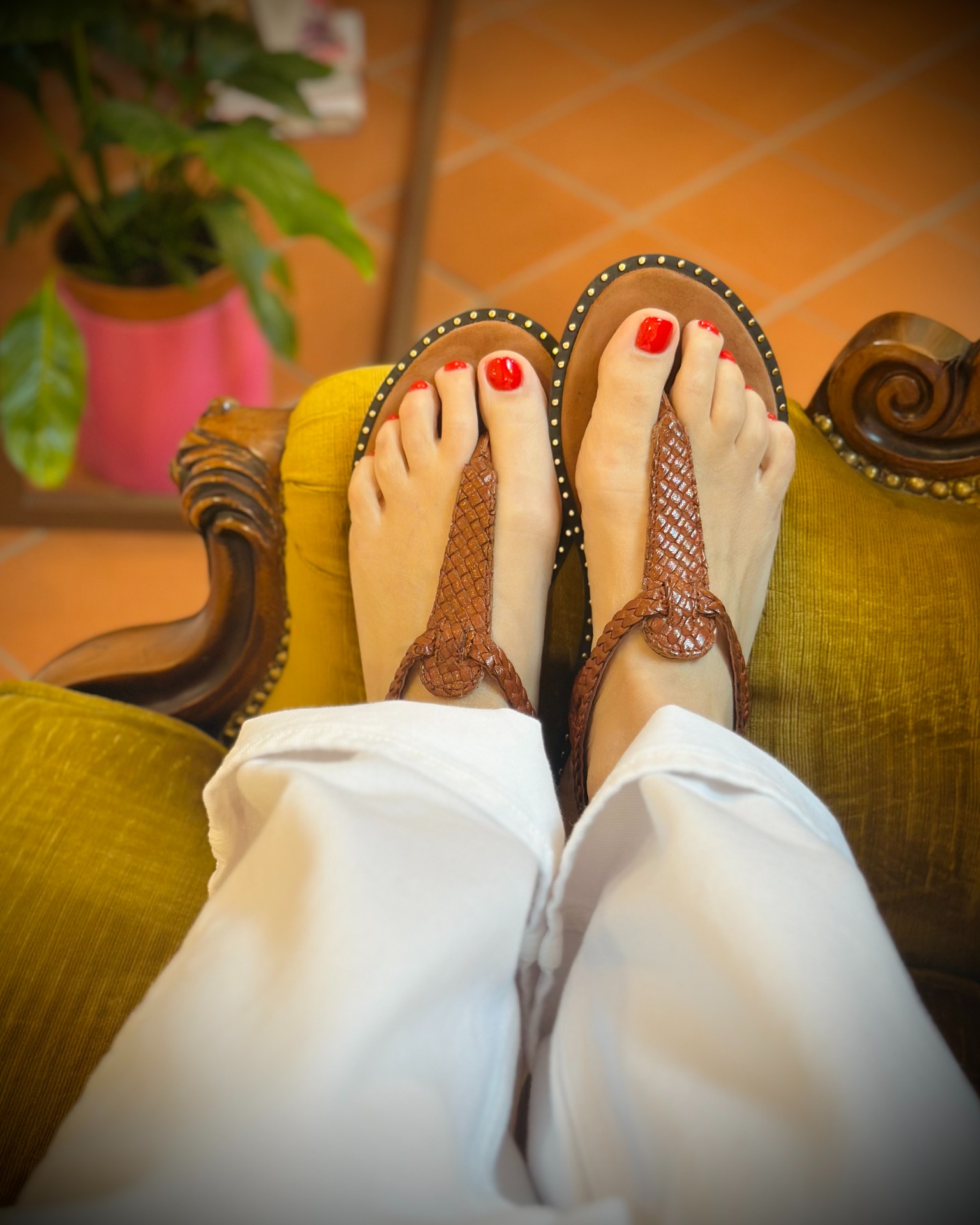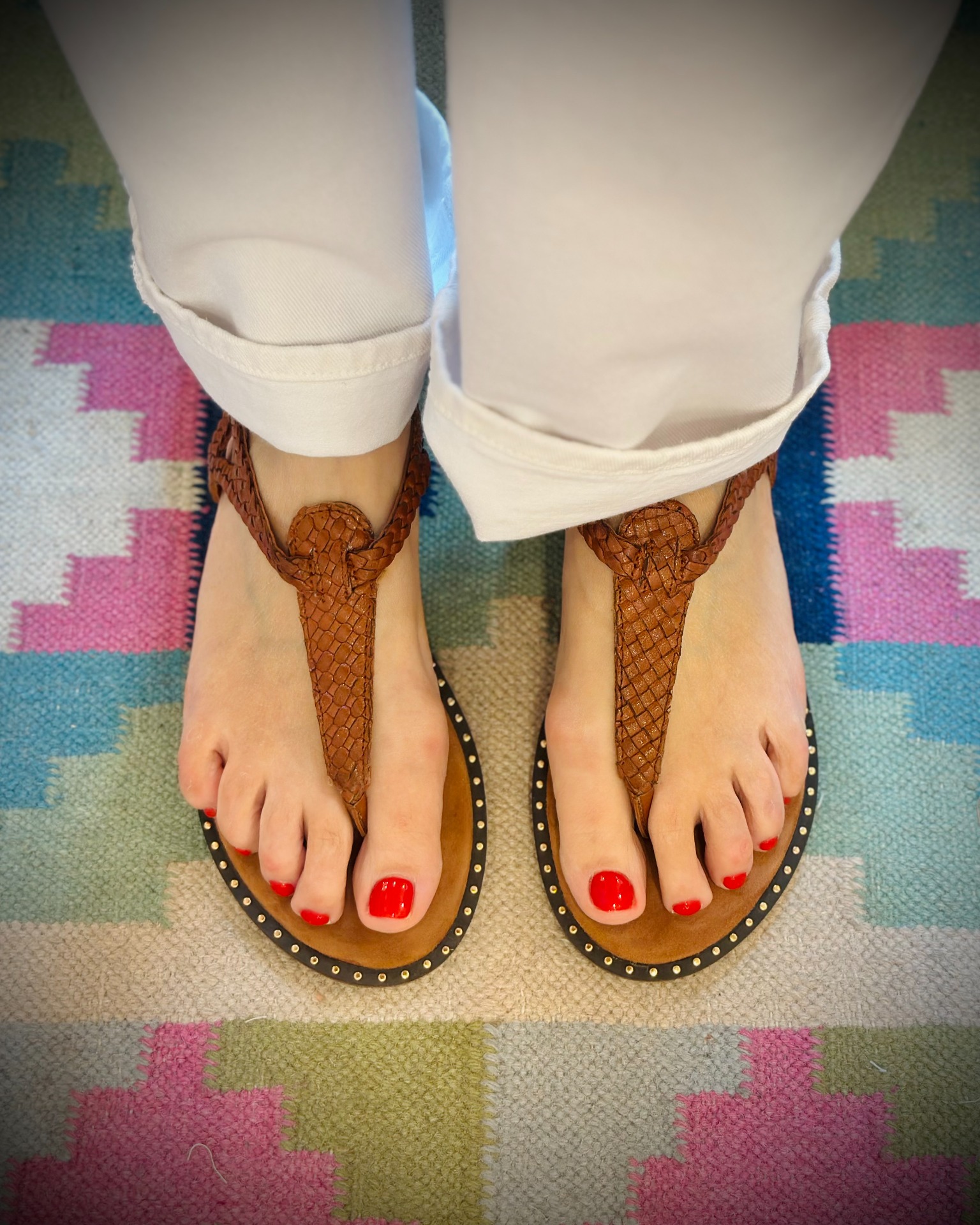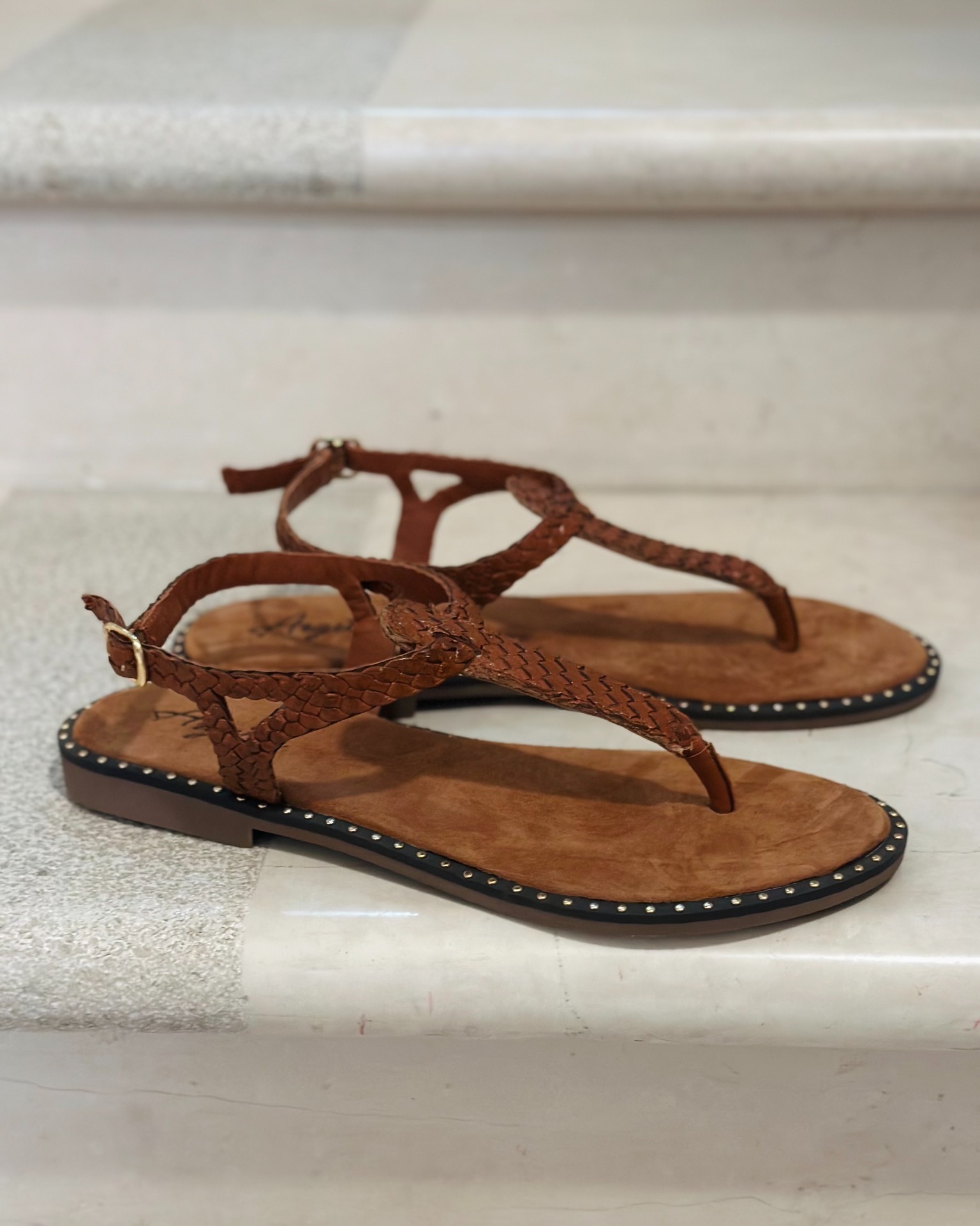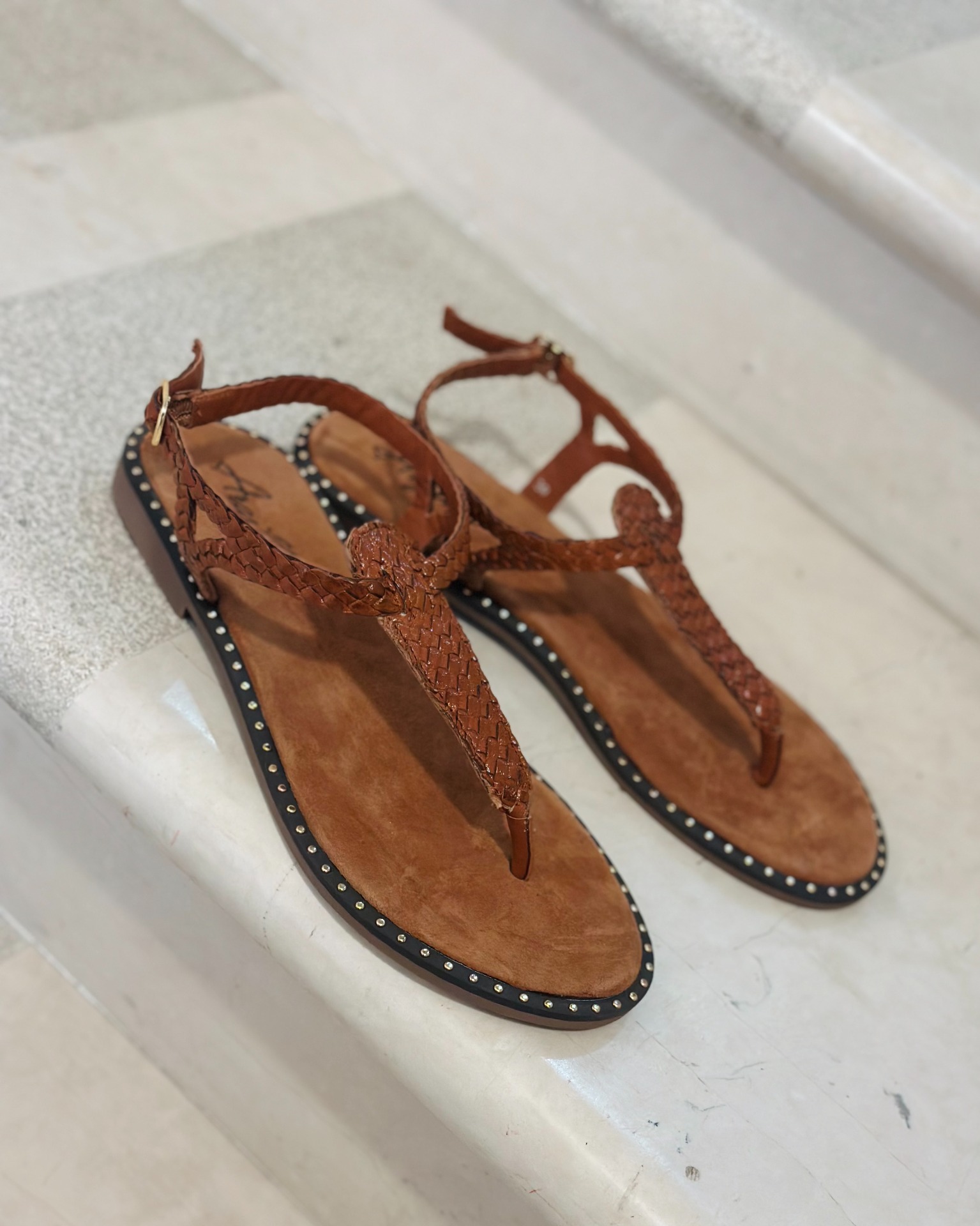 Infradito con intrecci in pelle color caramello, piccoli dettagli dorati sulla pianta lo rendono grintoso.