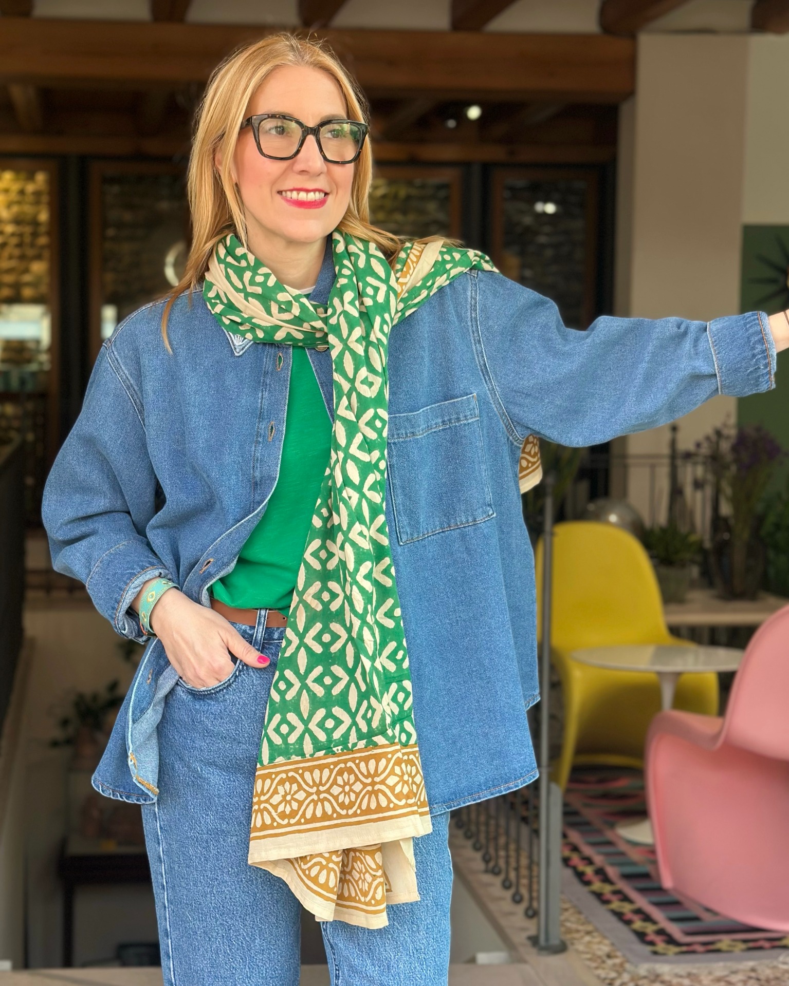 Sciarpa stampata a mano, 100% cotone. Misure 180 cm x 110 cm.