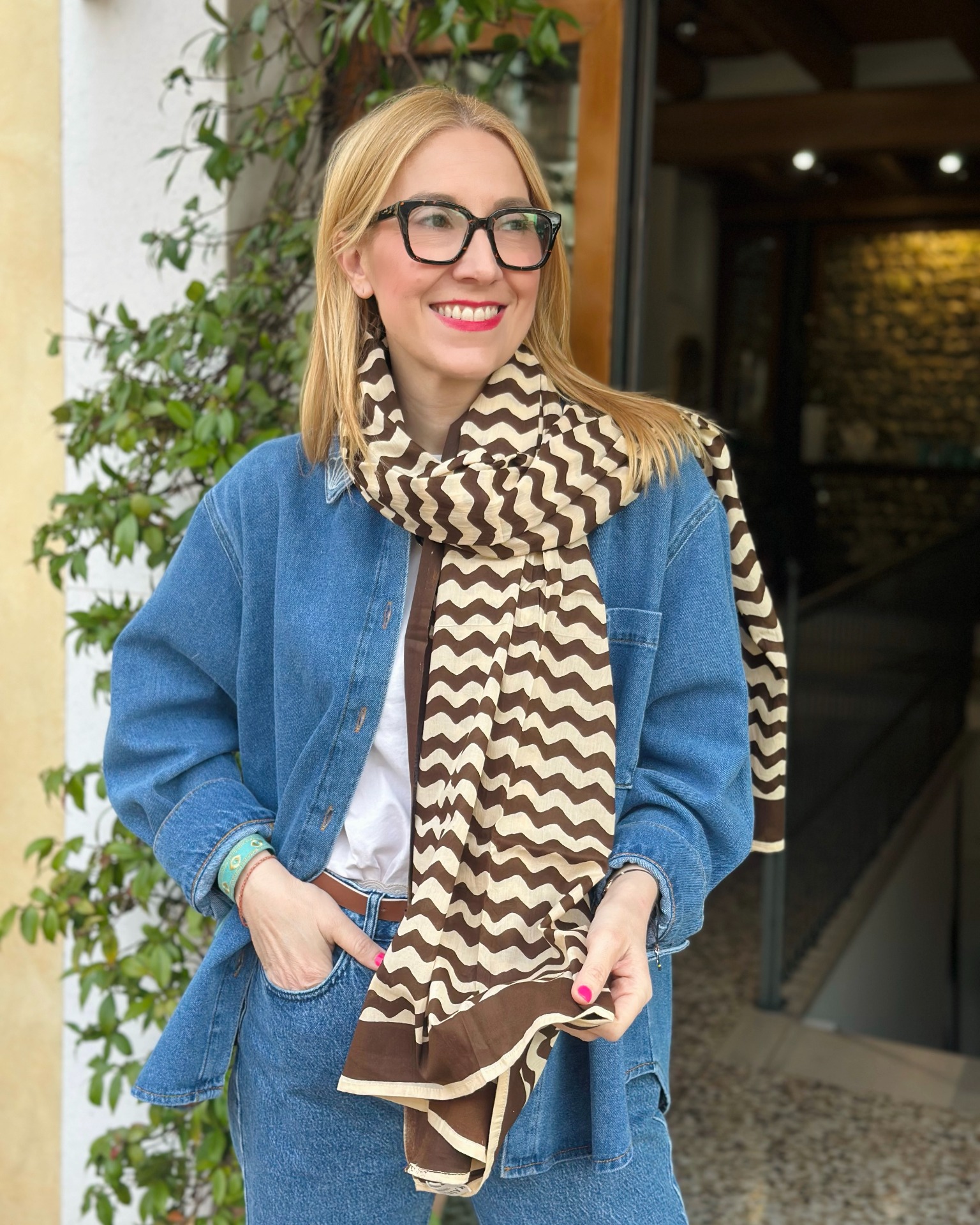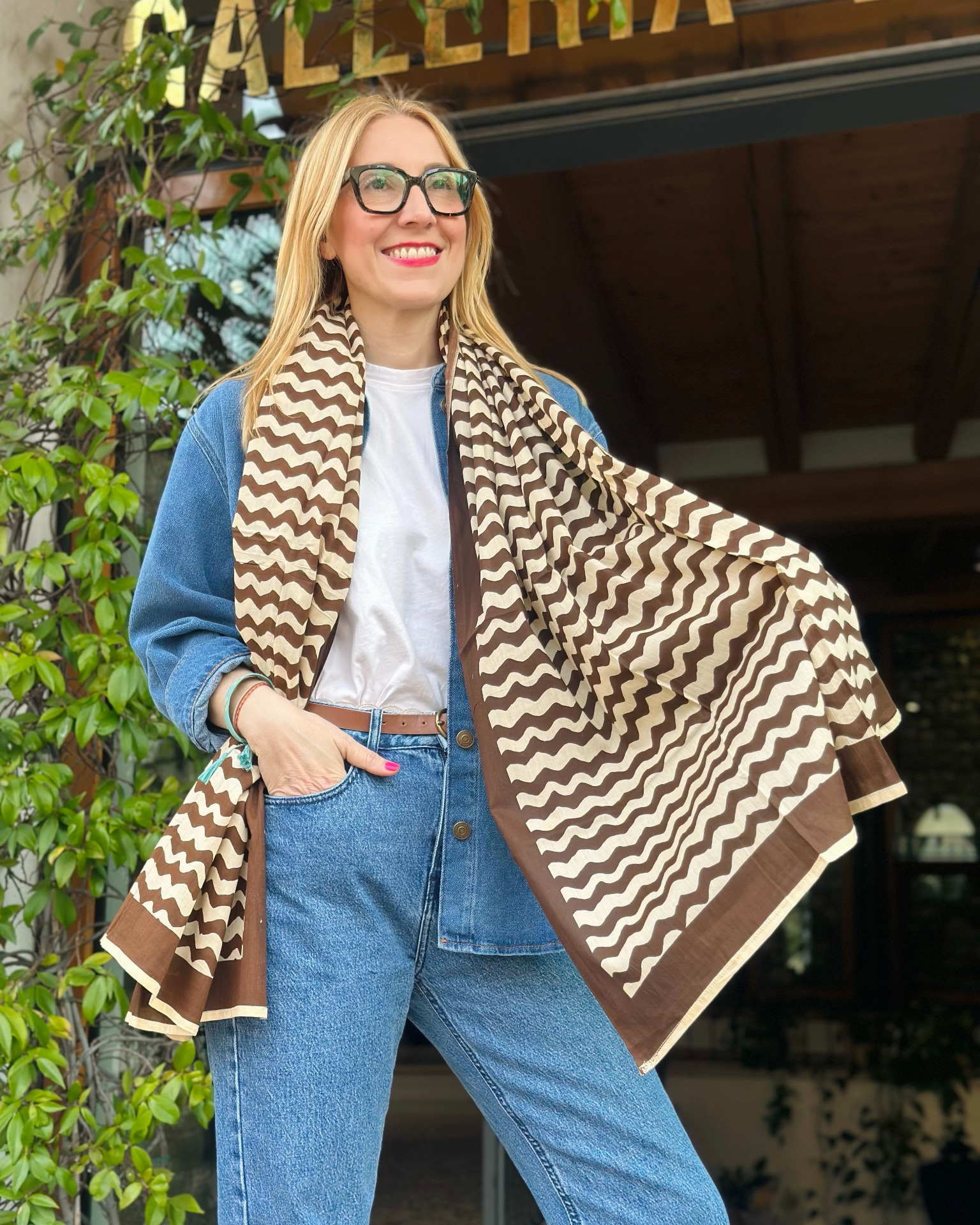 Sciarpa stampata a mano, 100% cotone. Misura 180 cm x 110 cm.