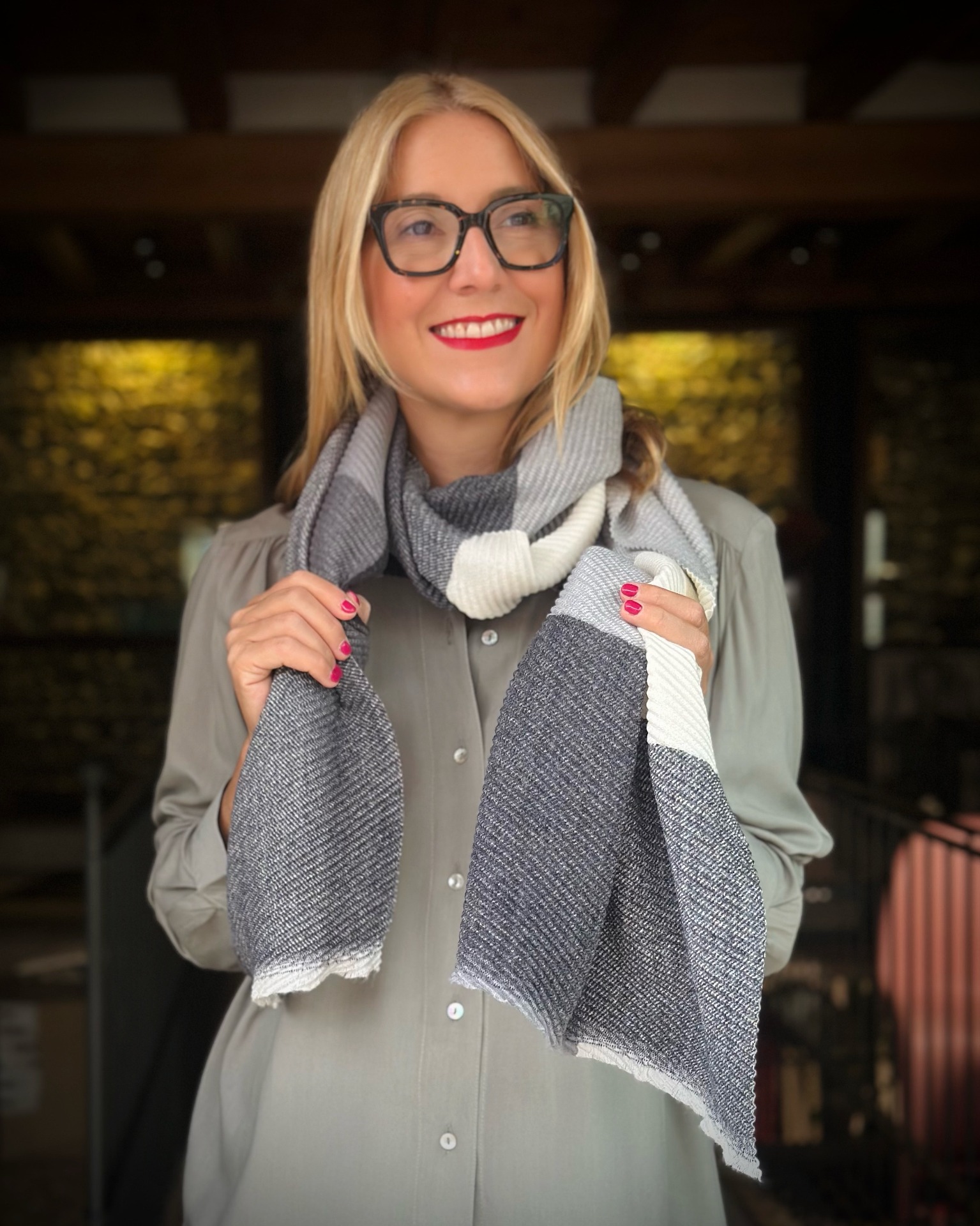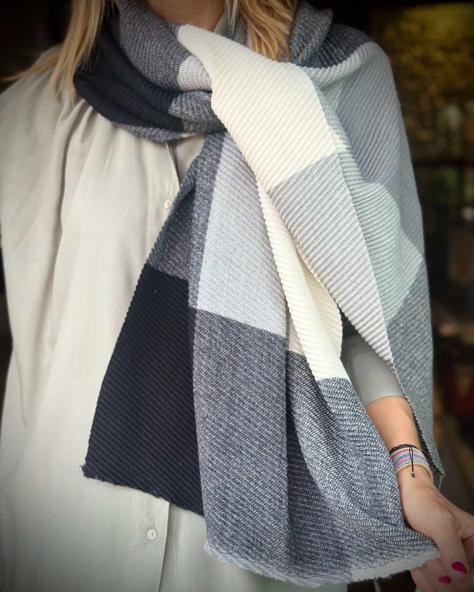 Sciarpa effetto plissè. Materiale 76% poly, 24% viscosa.