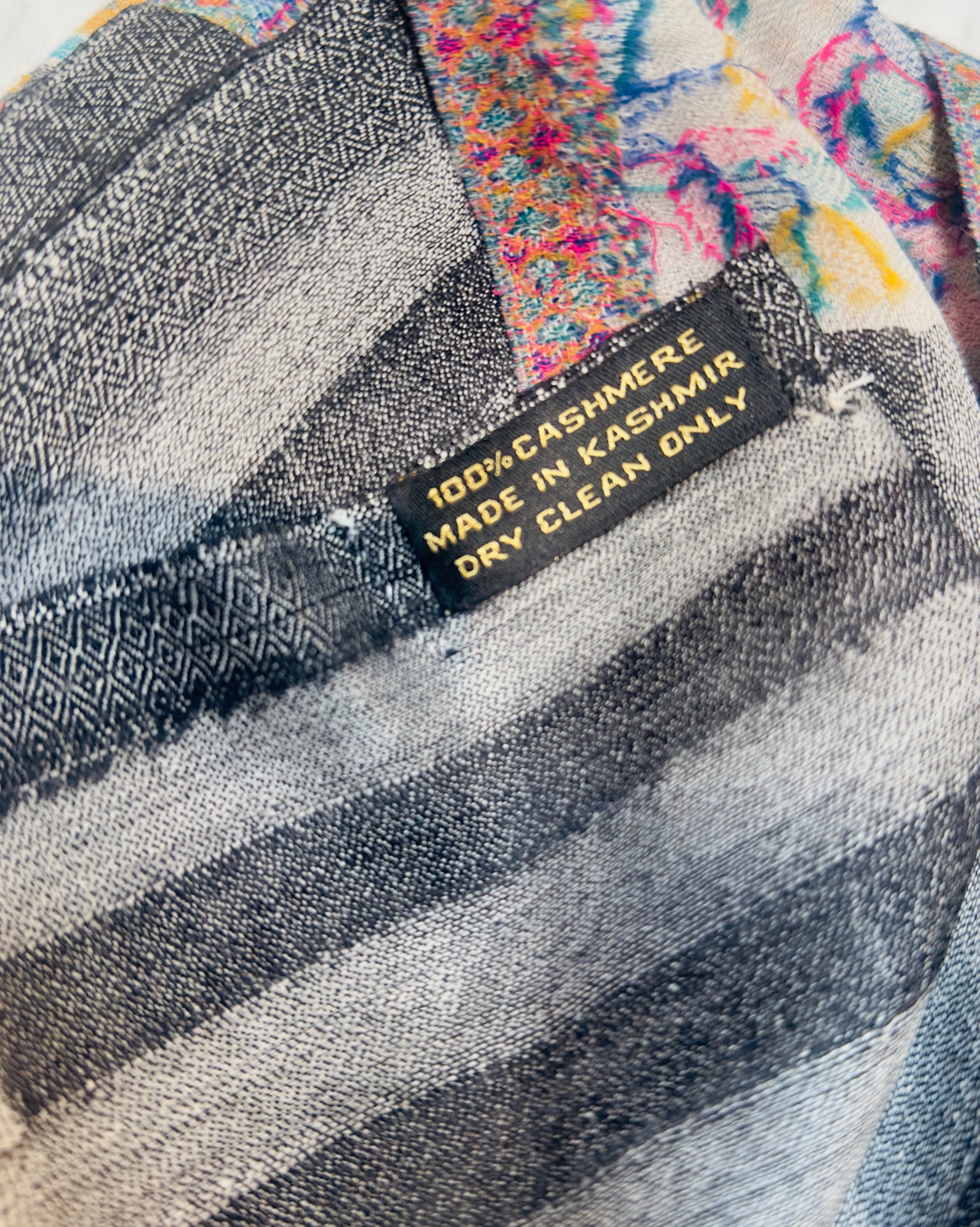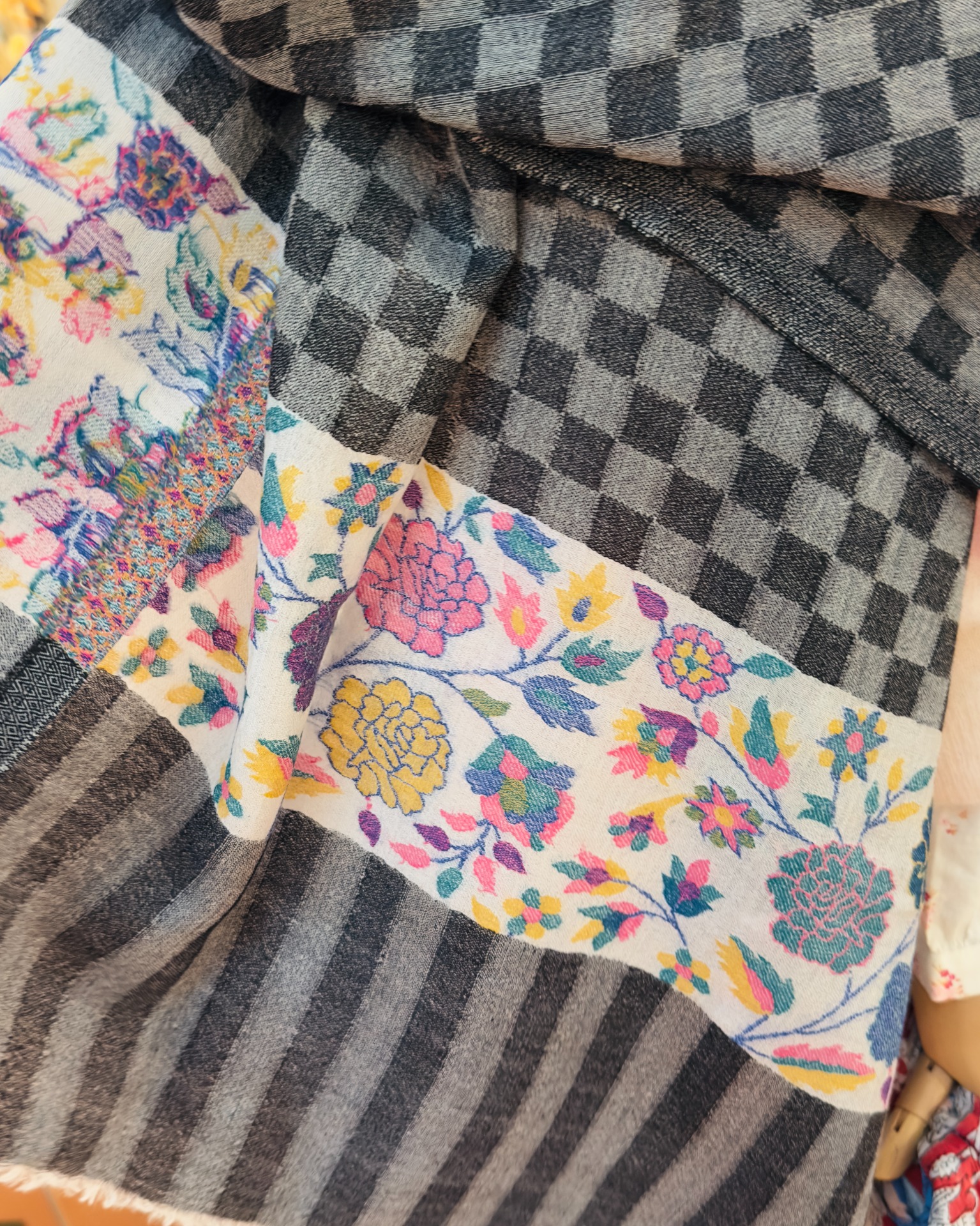 Sciarpa realizzata in cashmere originale, raffinato motivo a scacchi arricchito da un bordo decorativo floreale a contrasto. Ideale tutto l'anno.
