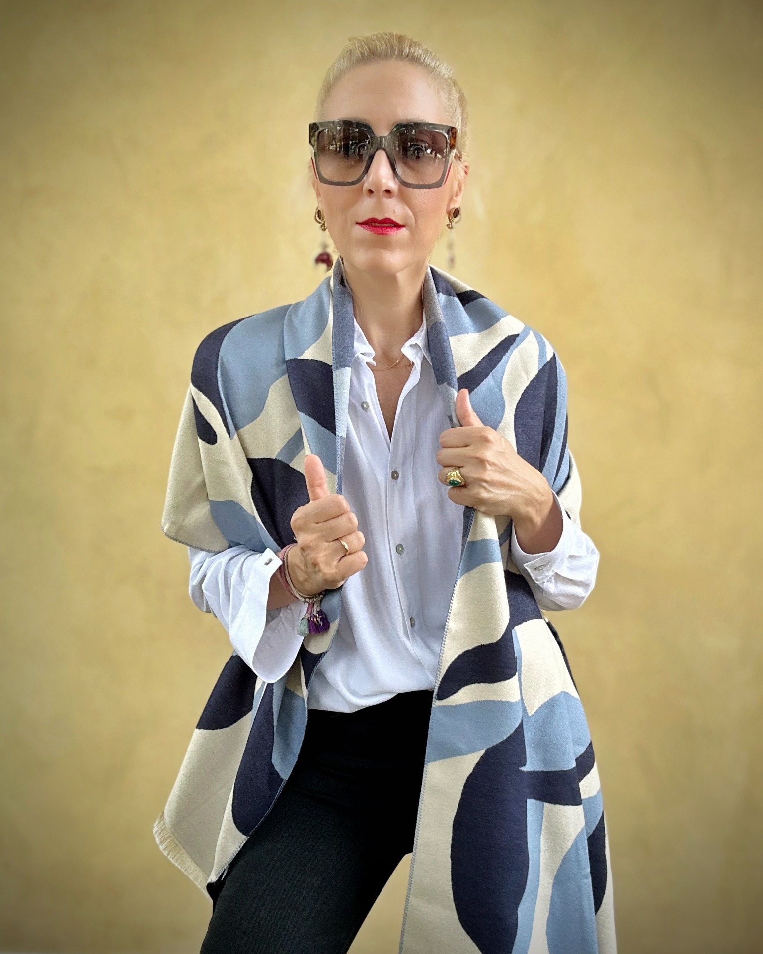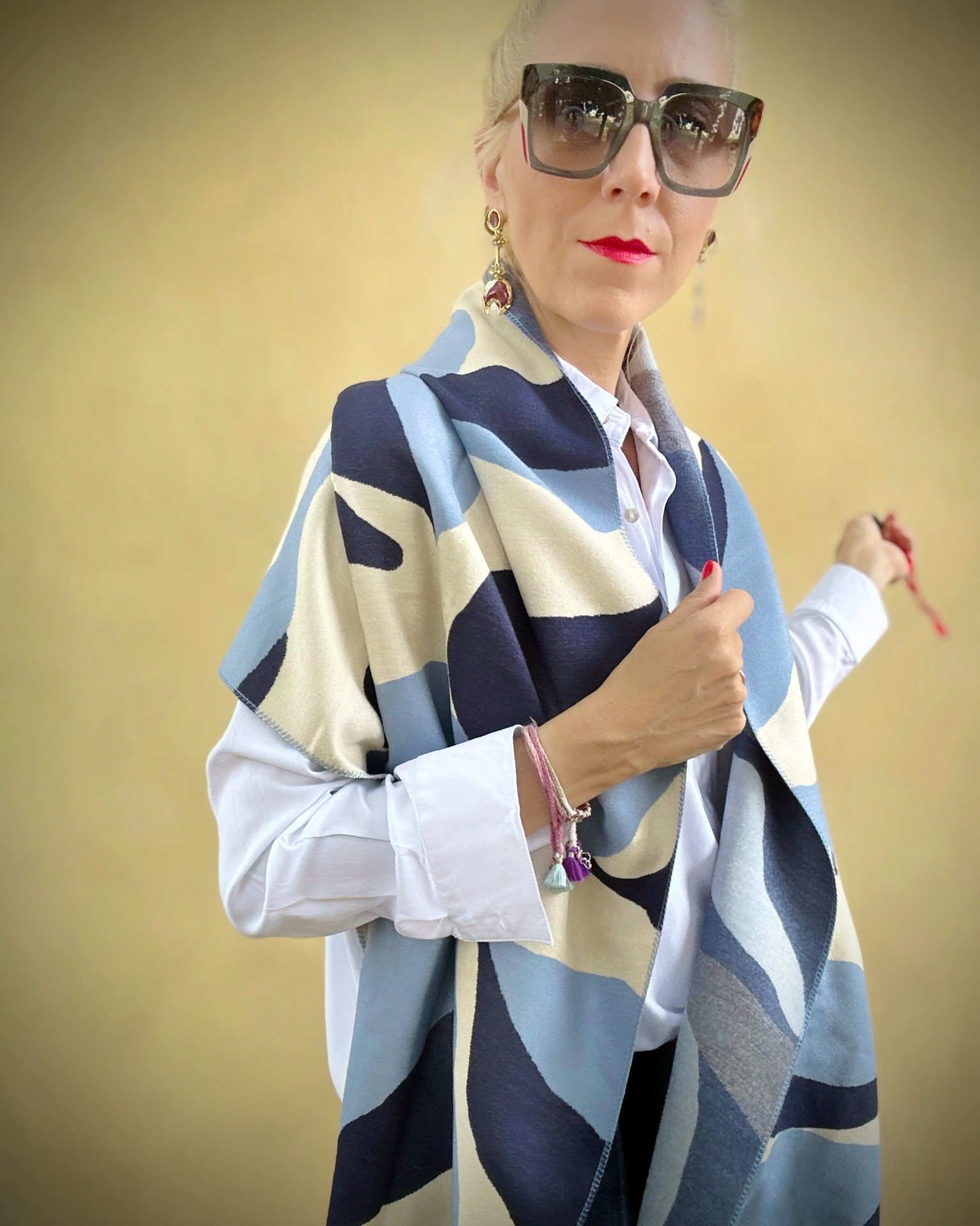 Sciarpa/stola stampata in fantasia azzurro/ecrù/marine. Materiale 77% viscosa, 23% poly.