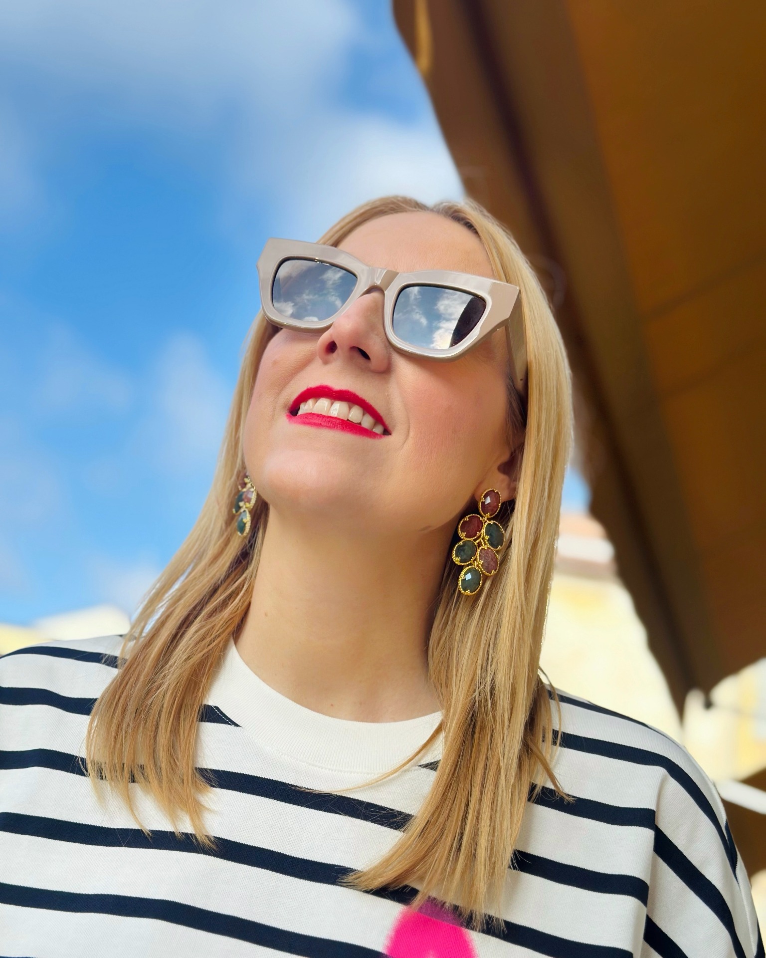 T-shirt righe alla marinara dal taglio over, la stampa a cuore sul lato sinistro dona uno stile urban chic.