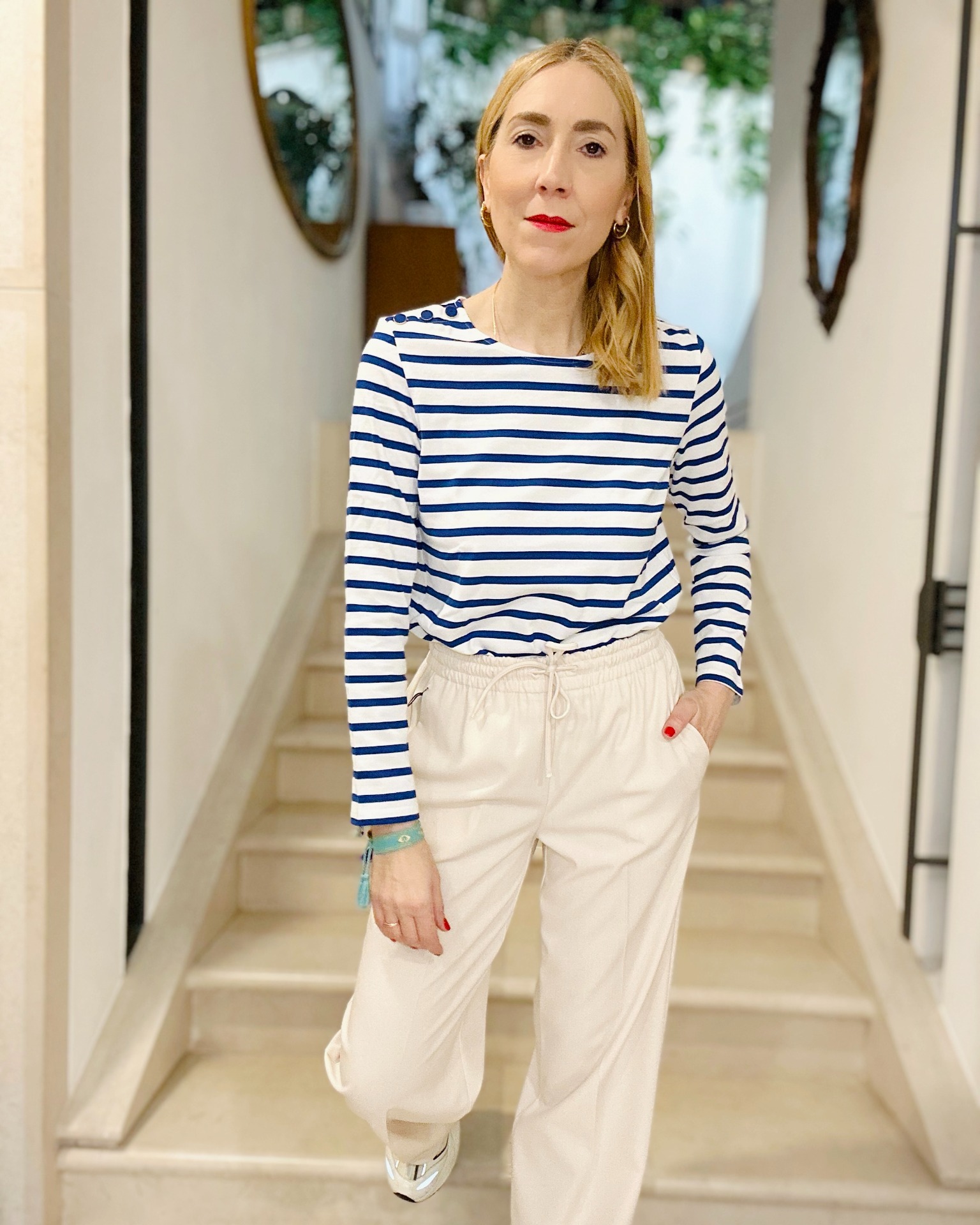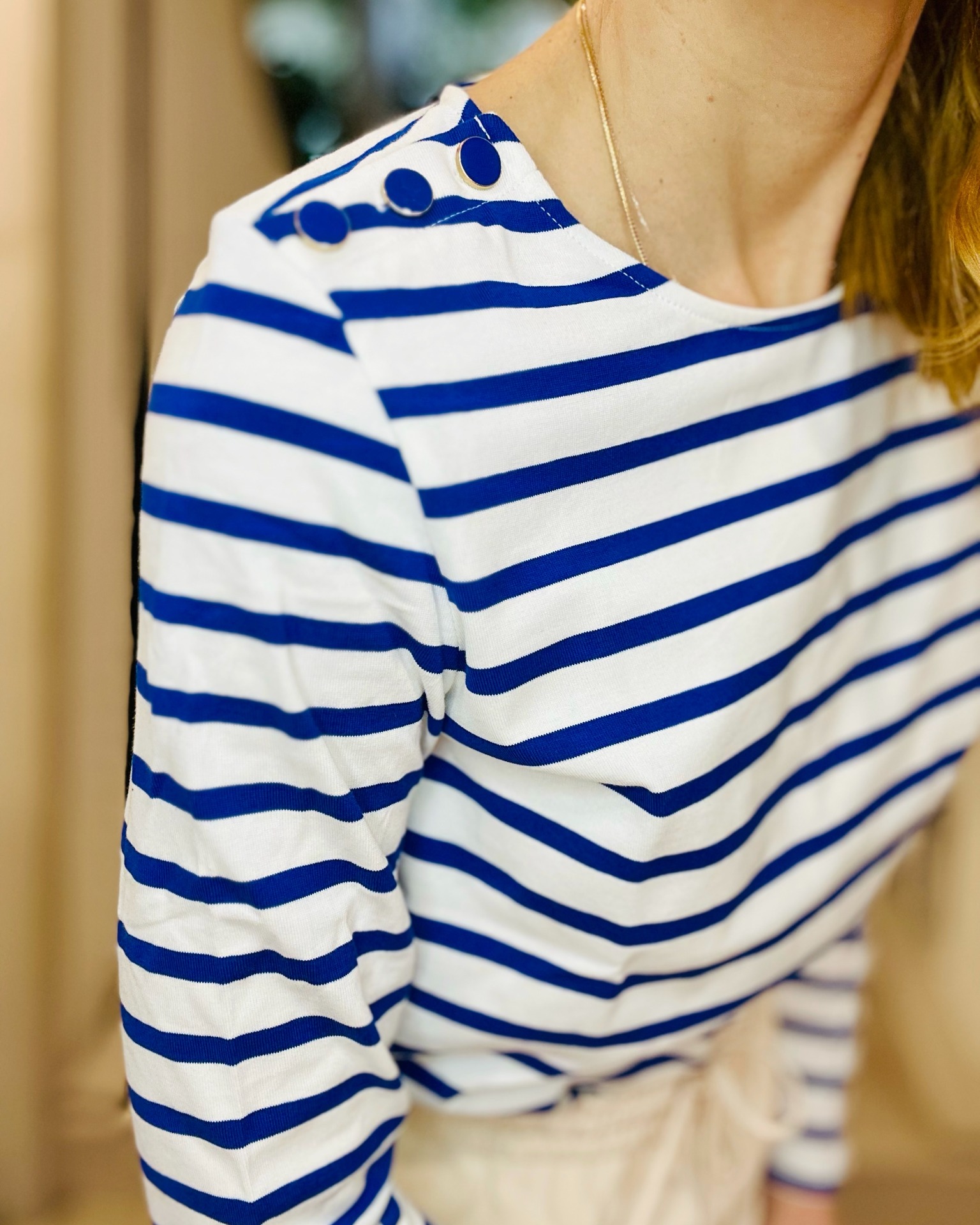 Tee shirt a manica lunga, righe blu/ecrù. Raffinati bottoni sulla spalla sinistra.