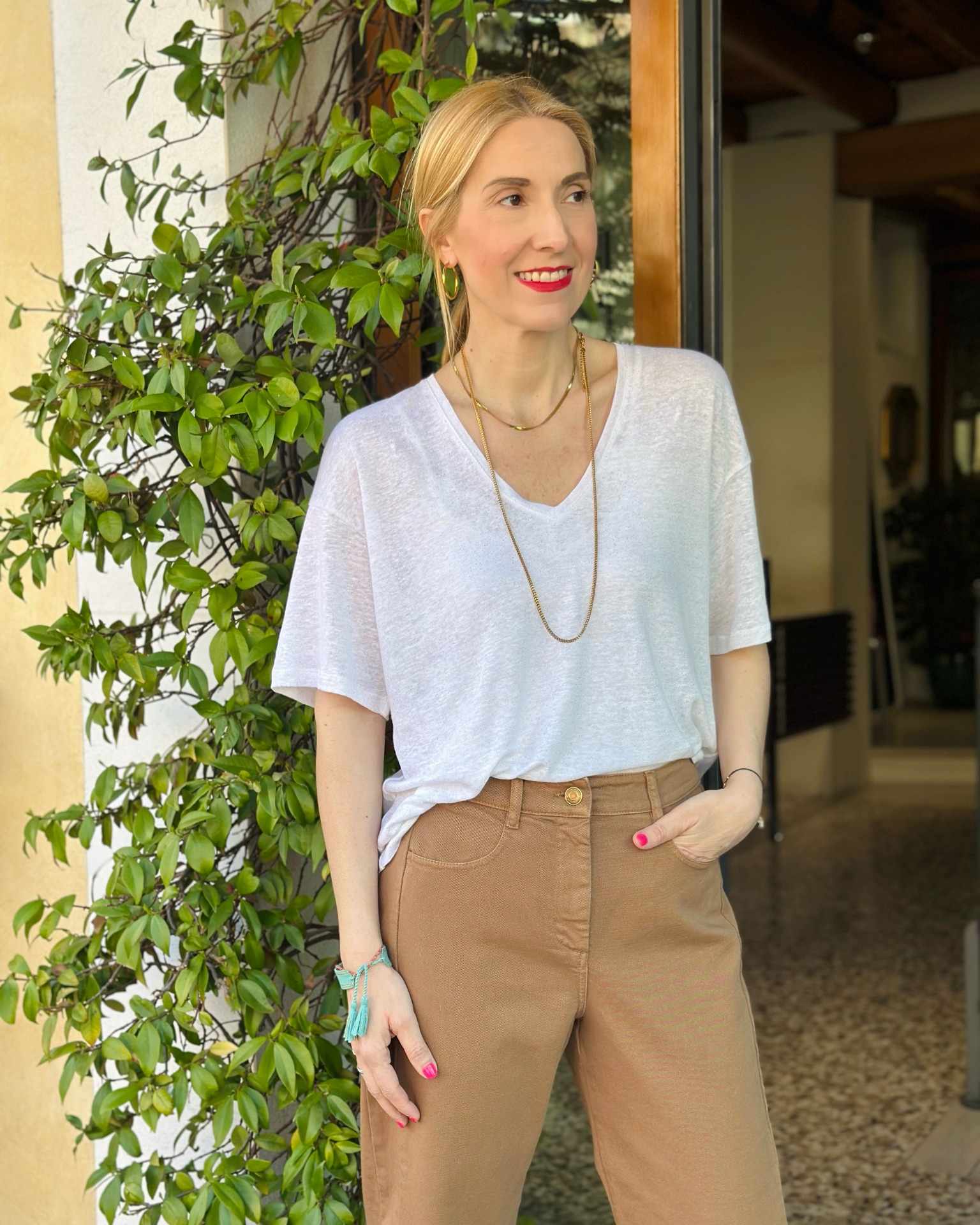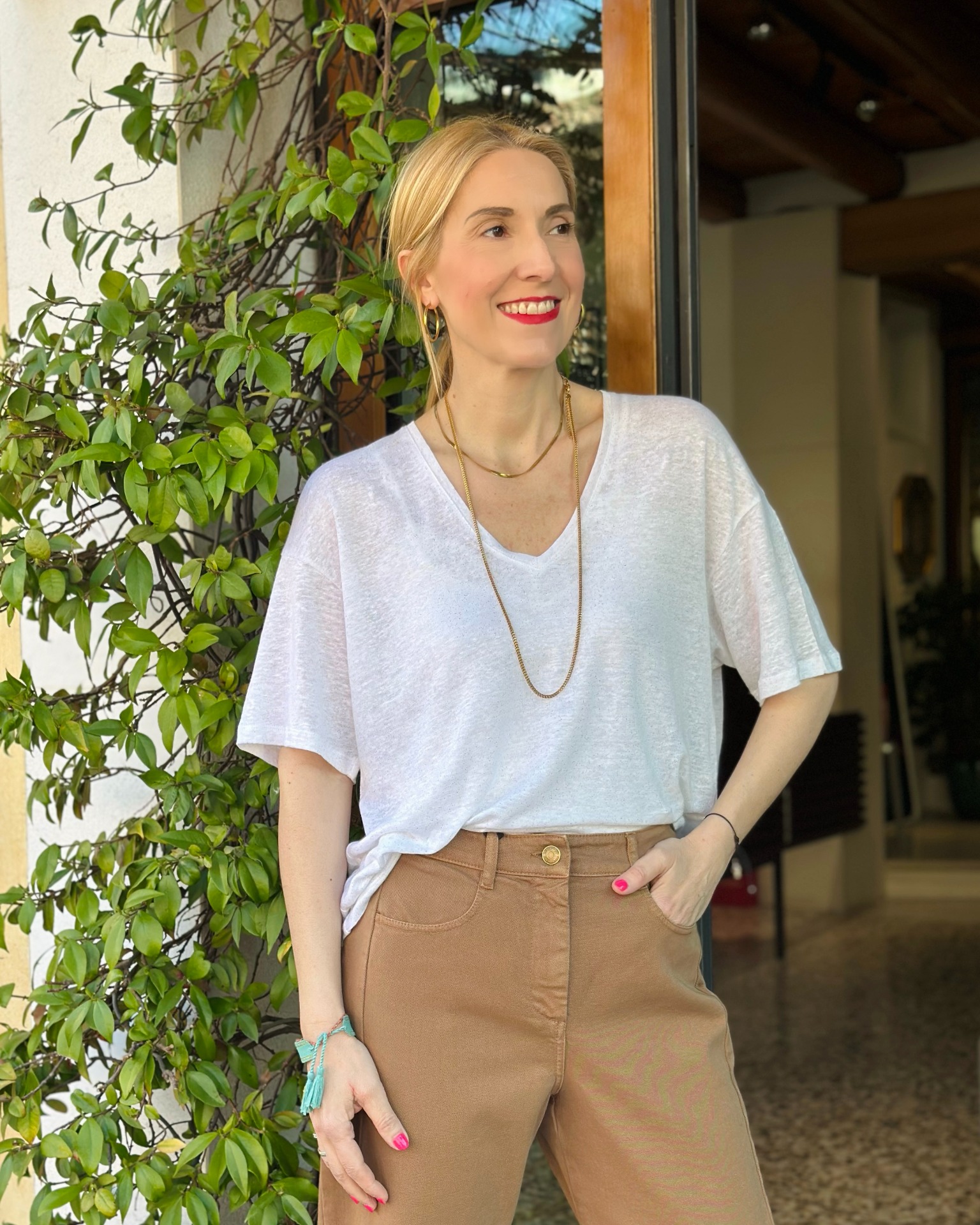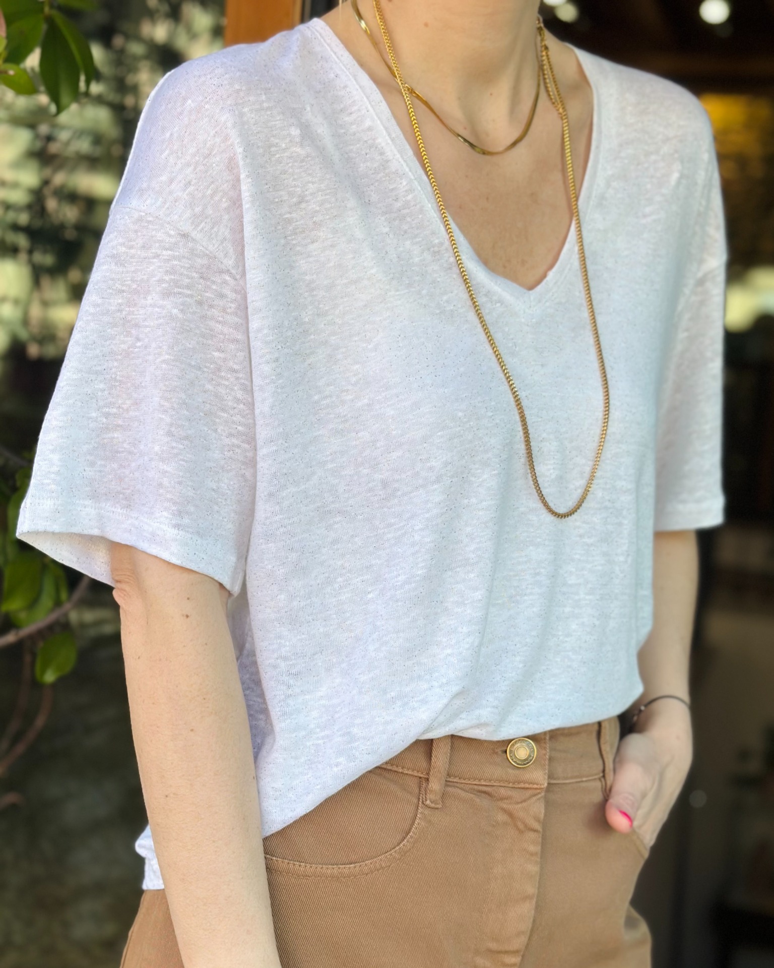 Taglio contemporaneo e scollo a V, il basic perfetto da indossare tutta l'estate. Impreziosita da un sottile filo in lurex bronzo. Vestibilità ampia.