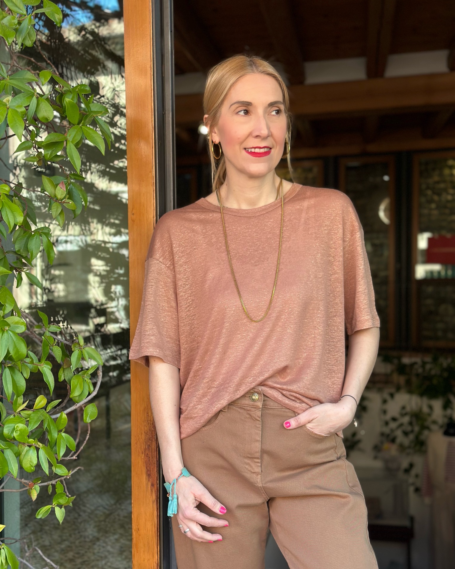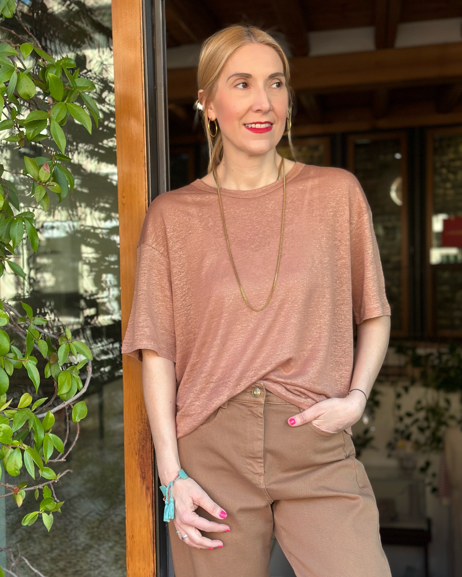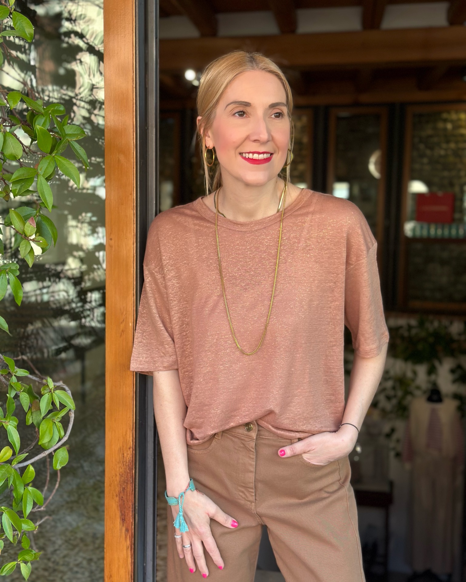 Taglio contemporaneo, la tee shirt girocollo è il basic perfetto da indossare tutta l' estate. Impreziosita da un sottile filo in lurex bronzo. Vestibilità ampia.